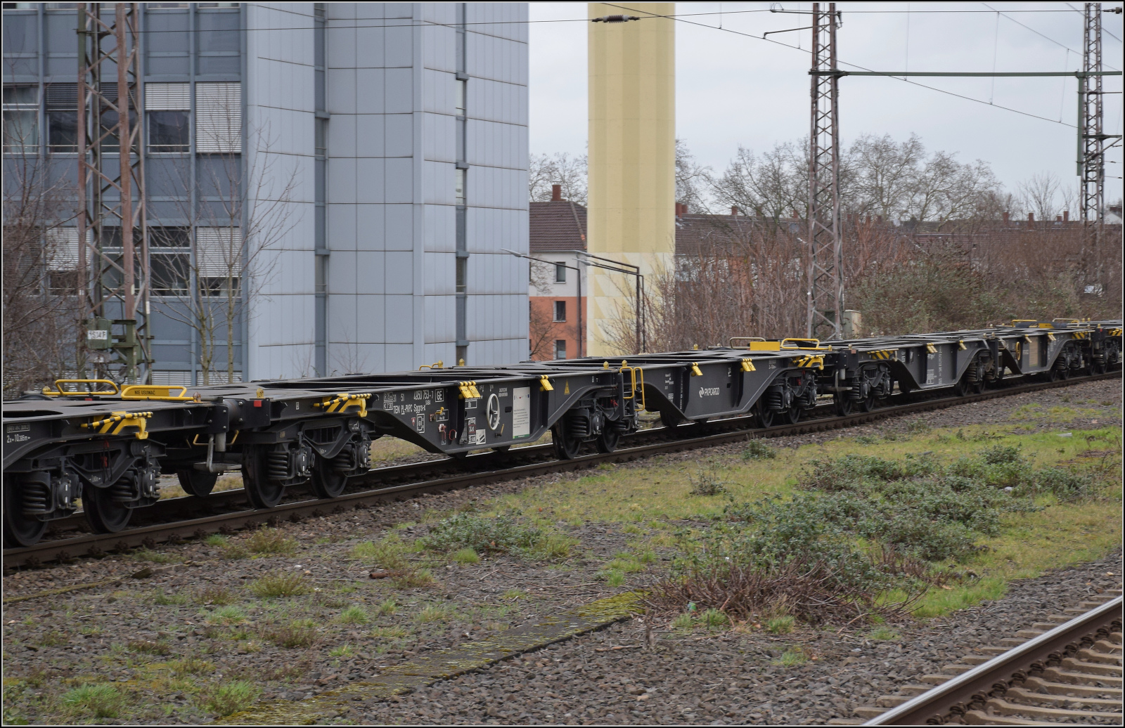 Der polnische Vectron 91 51 5370 030-6 PL-PKP zieht jede Menge neue Containertragwagen durch Duisburg. Hier ein Blick auf die lange Schlange der Wagen vom Typ Sggrs-x. Daneben ist 151 075 von SRI mit den verschiedenen Gesichtern geparkt. Februar 2026.