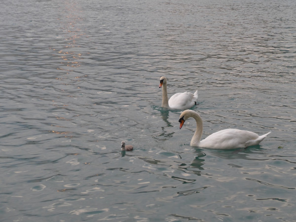 (161'725) - Schwanenpaar mit Jungem am 4. Juni 2015 auf der Aare bei Steffisburg