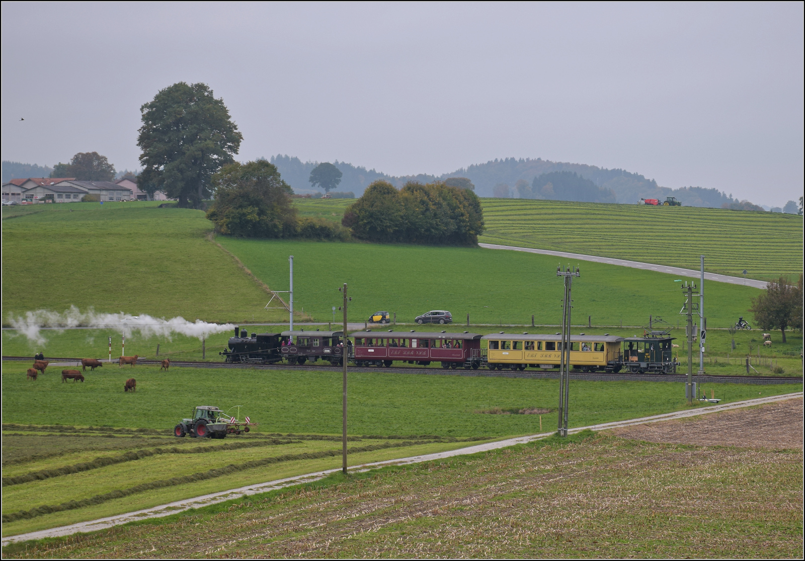 Damit BSB Ed 3/4 51 auf ihrer Heimstrecke einen Pendelzug fahren kann, ist an der Zugspitze Te 2/2 155 der EBT eingereiht. Häusern/Althaus, Oktober 2025. km0