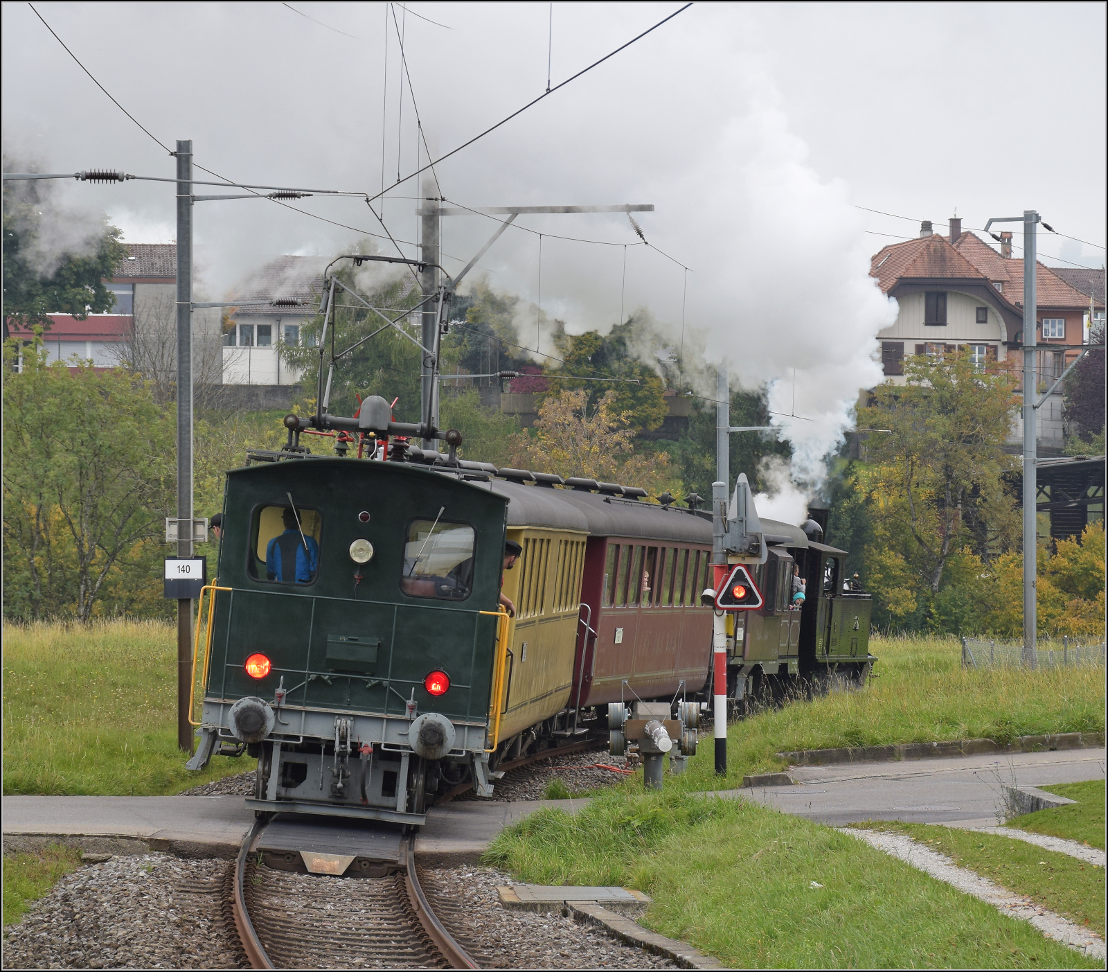 BSB Ed 3/4 51 auf ihrer Heimstrecke, bevor sie wegen ETCS ein Hausverbot bekommt, an der Zugspitze Te 2/2 155 der EBT. Häusern/Althaus, Oktober 2025. km0