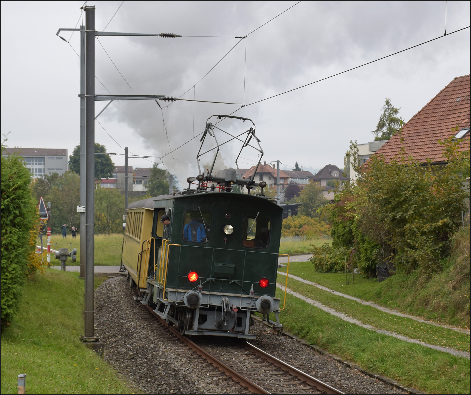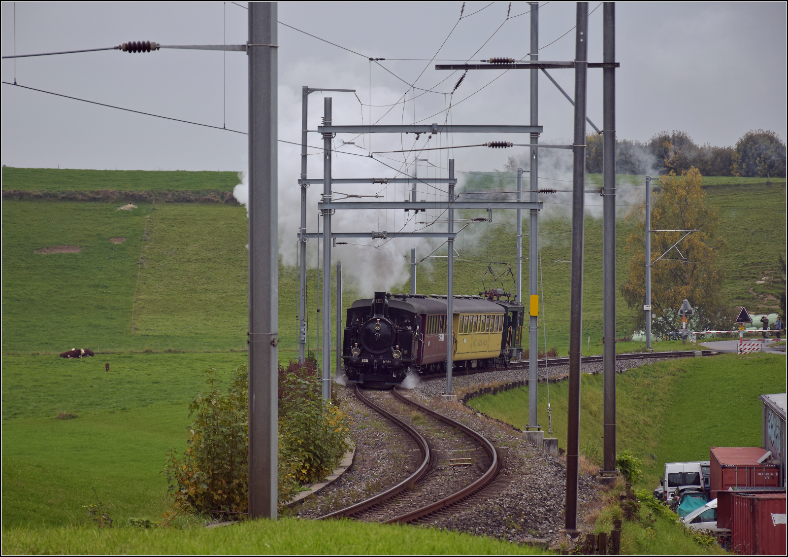 BSB Ed 3/4 51 auf ihrer Heimstrecke, bevor sie wegen ETCS ein Hausverbot bekommt. Hier bei der Einfahrt in den Bahnhof Schwarzenburg. Oktober 2025. km0