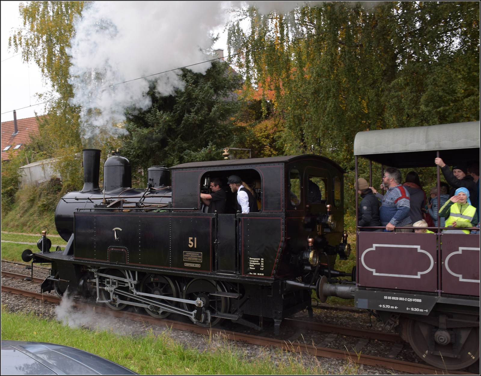 BSB Ed 3/4 51 auf ihrer Heimstrecke, bevor sie wegen ETCS ein Hausverbot bekommt. Hier bei der Einfahrt in den Bahnhof Schwarzenburg. Im Bild ist der Wagen Bi 524 'Schmucktruckli'. Oktober 2025. km0