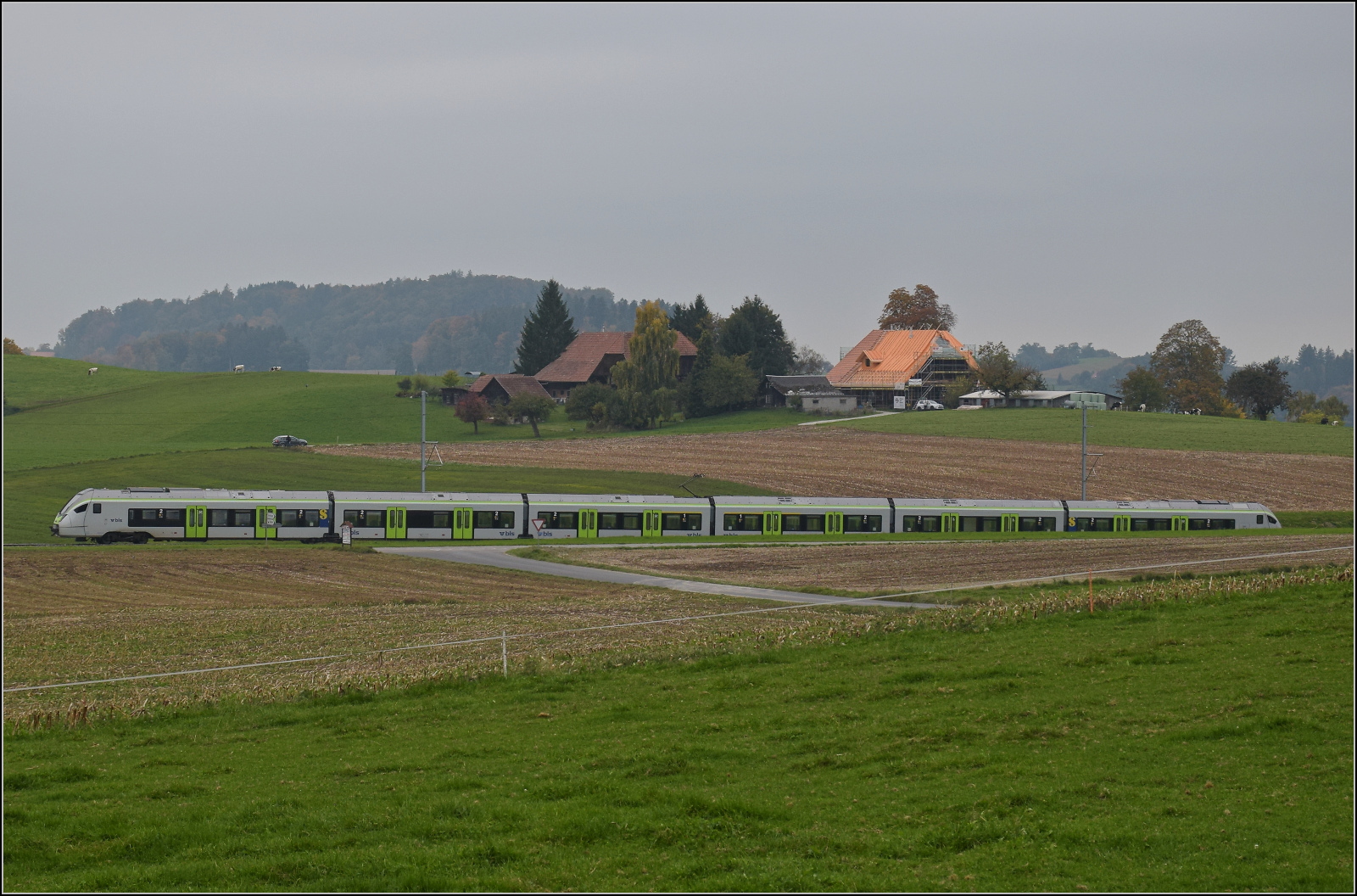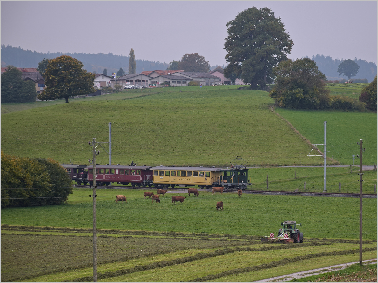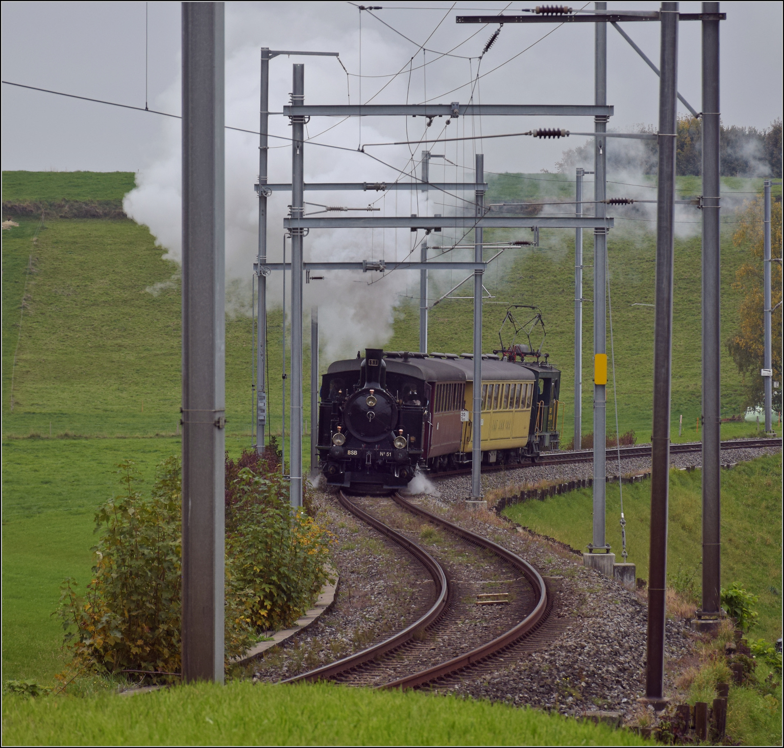 BSB Ed 3/4 51 auf ihrer Heimstrecke, bevor sie wegen ETCS ein Hausverbot bekommt. Hier im Feldmoos kurz vor der Einfahrt Schwarzenburg. Oktober 2025. km0