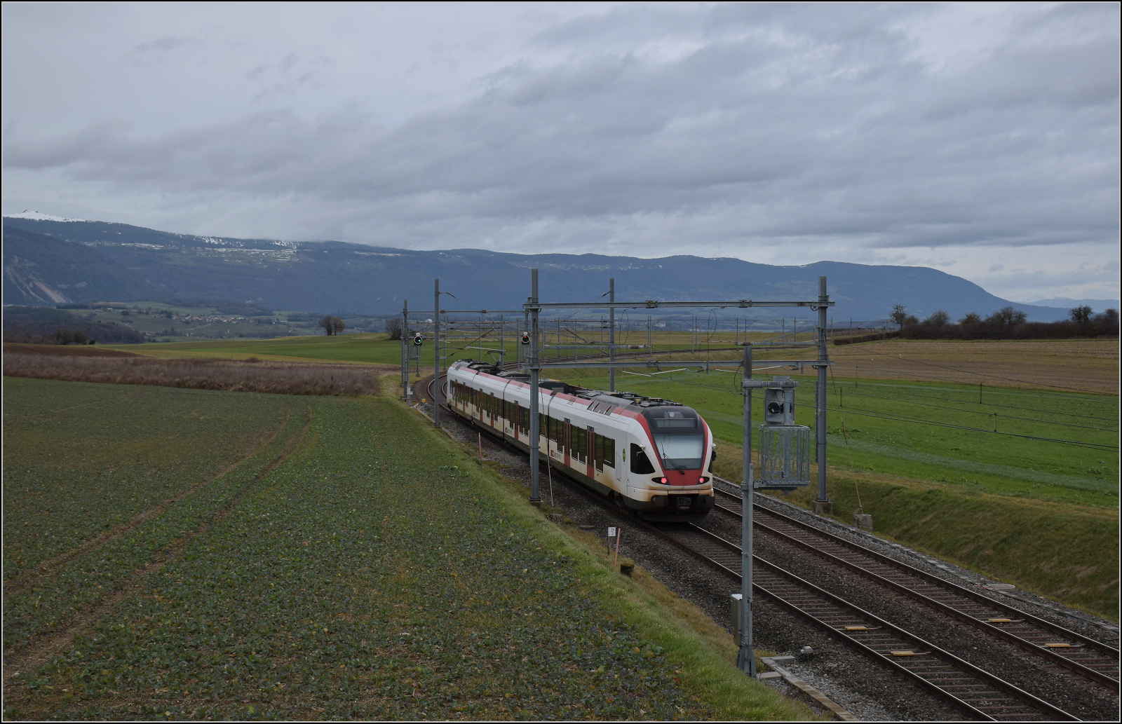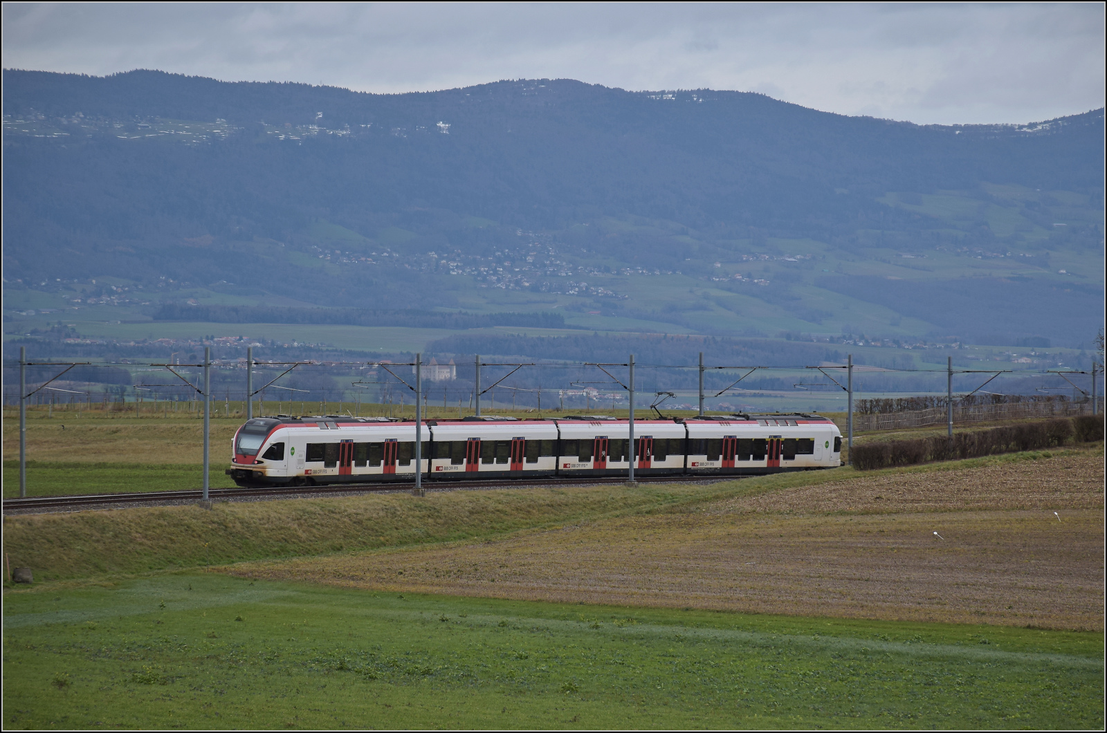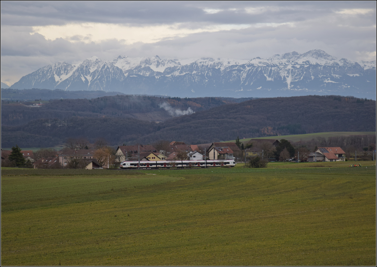 Im Fokus des Bildes ist der Bt 51 der Travys, 1982 von ACMV als EW I geliefert wurde. Er steht trotz einiger Rostflecken immer noch im Glanze seines Angesichts nahe der Bahnsteige in Yverdon-les-Bains. Dezember 2025. km0