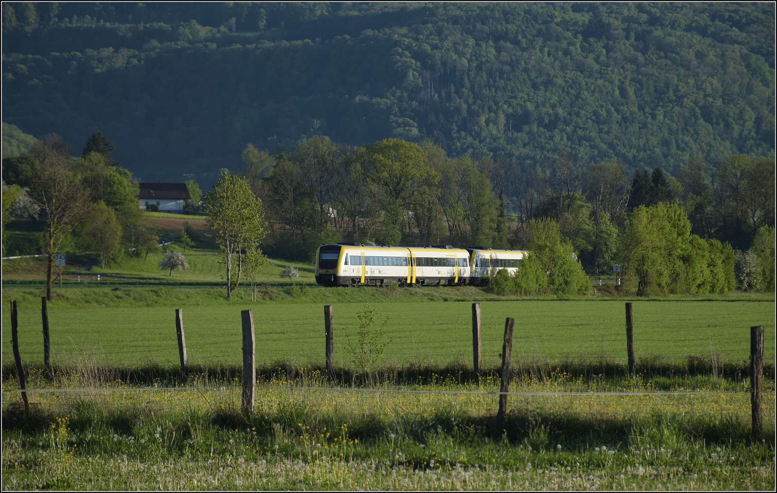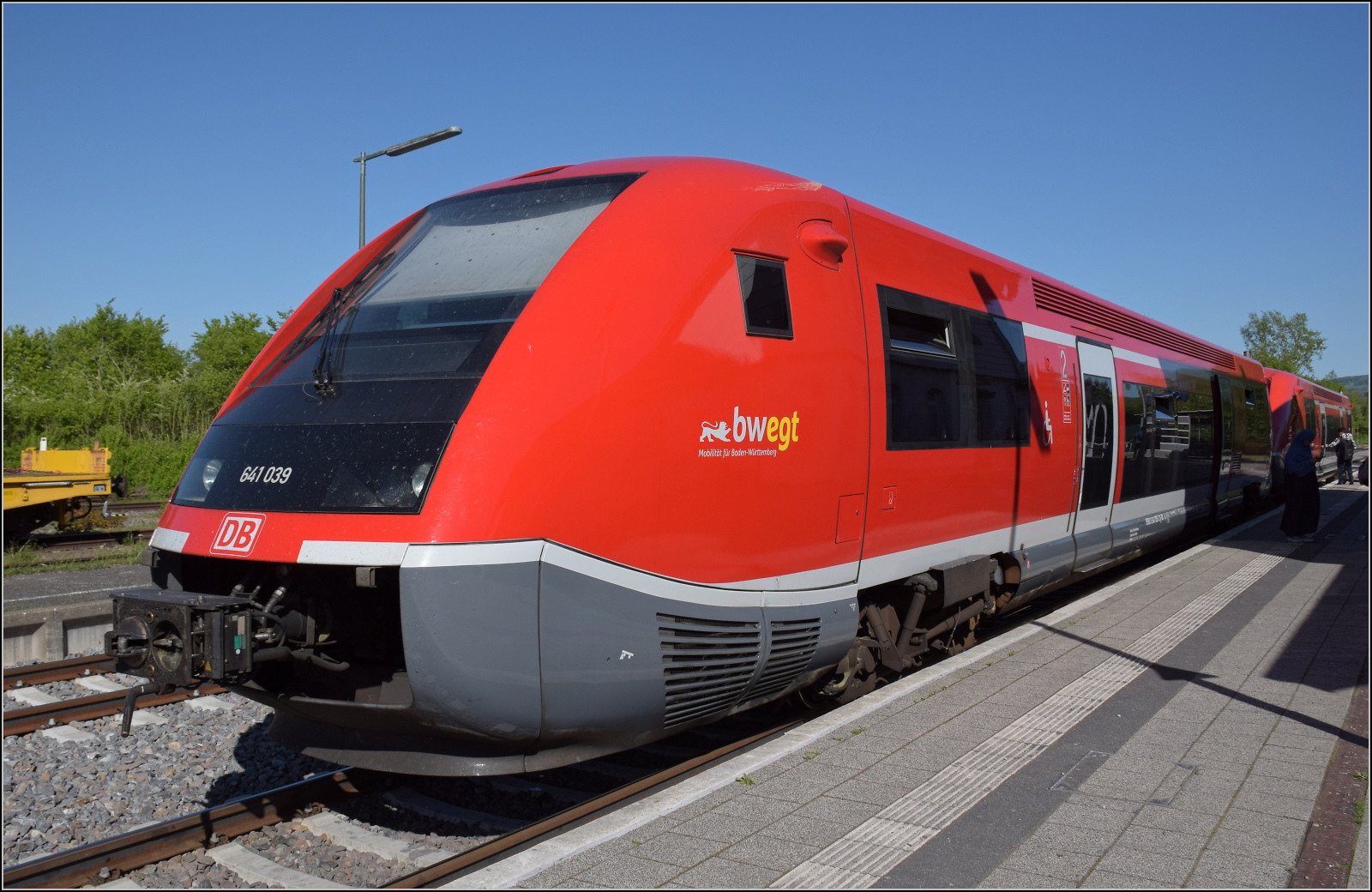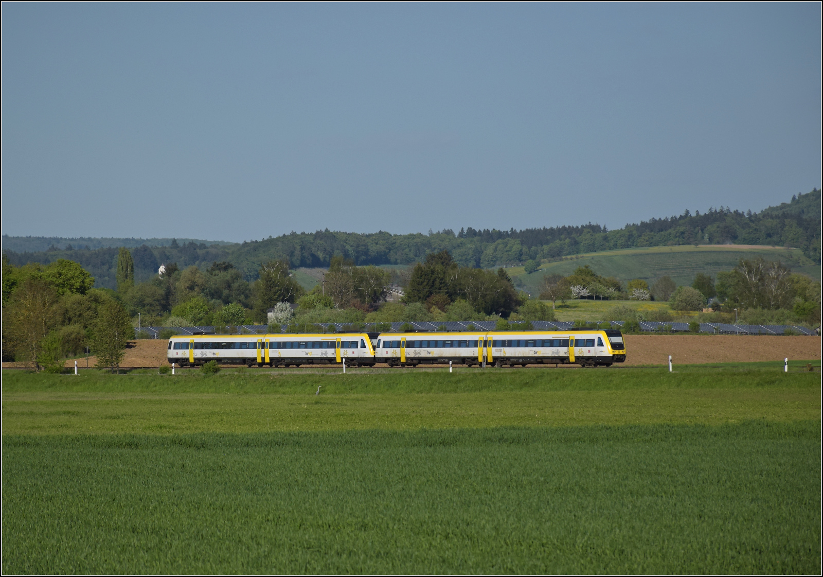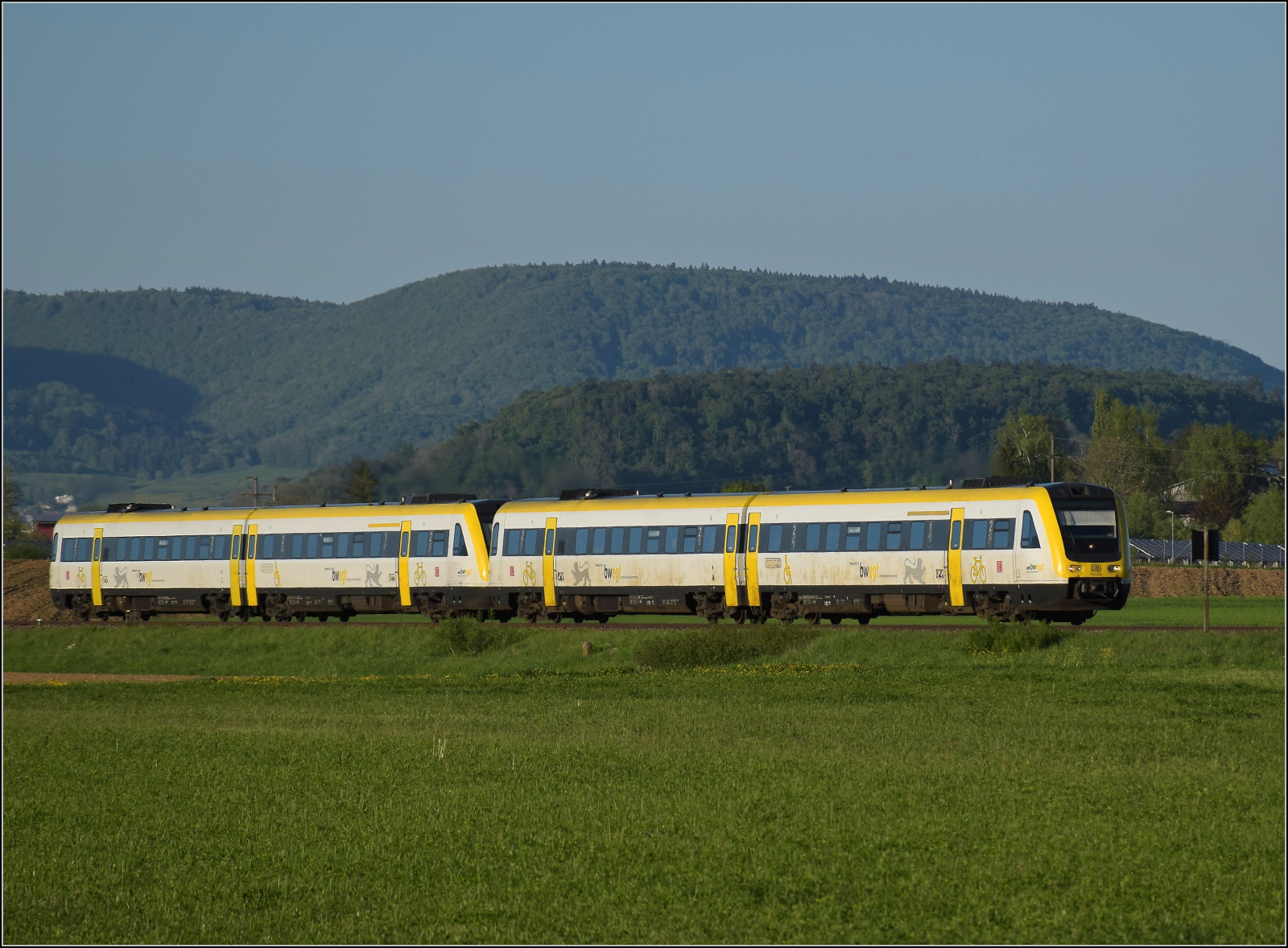 362 874 von Railsystems ist als Oldtimer mit Bauzug standesgemäß über die Sauschwänzlebahn nach Lauchringen gefahren. April 2026. km0