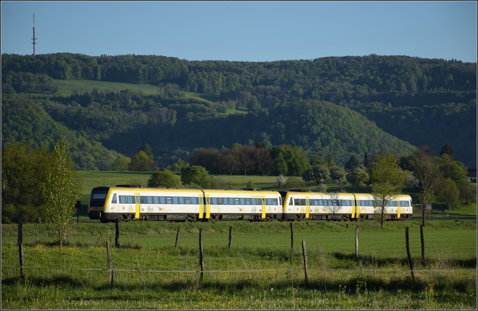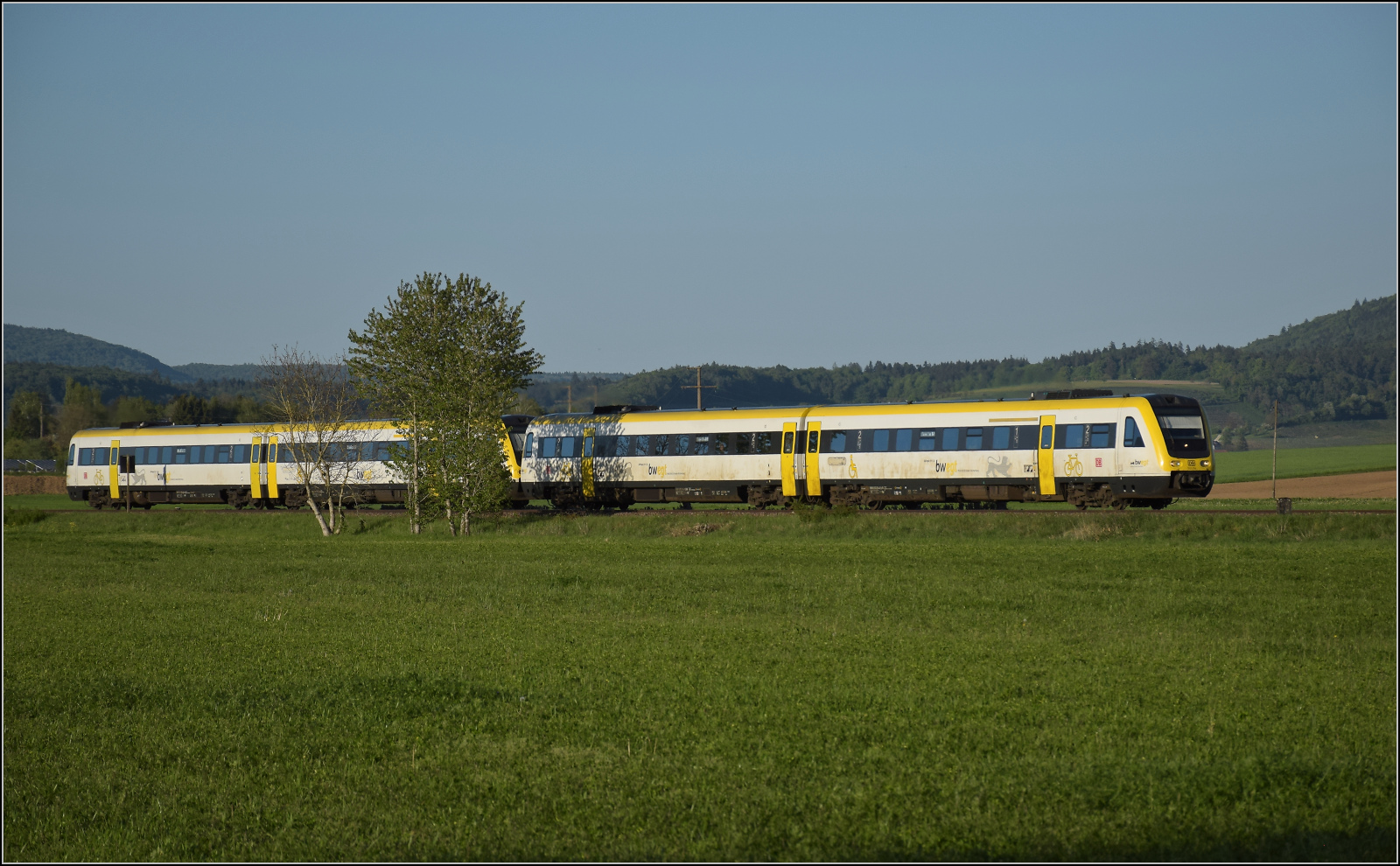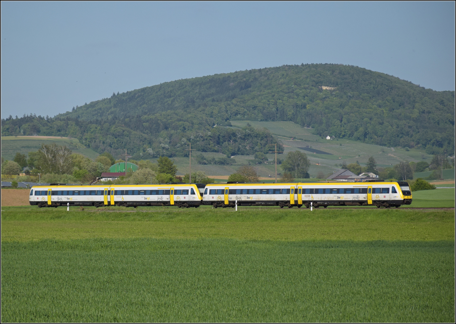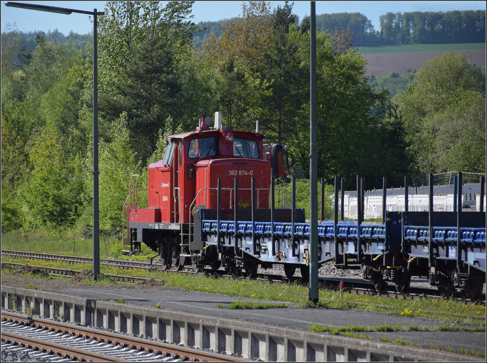 362 874 von Railsystems ist als Oldtimer mit Bauzug standesgemäß über die Sauschwänzlebahn nach Lauchringen gefahren. April 2026. km0