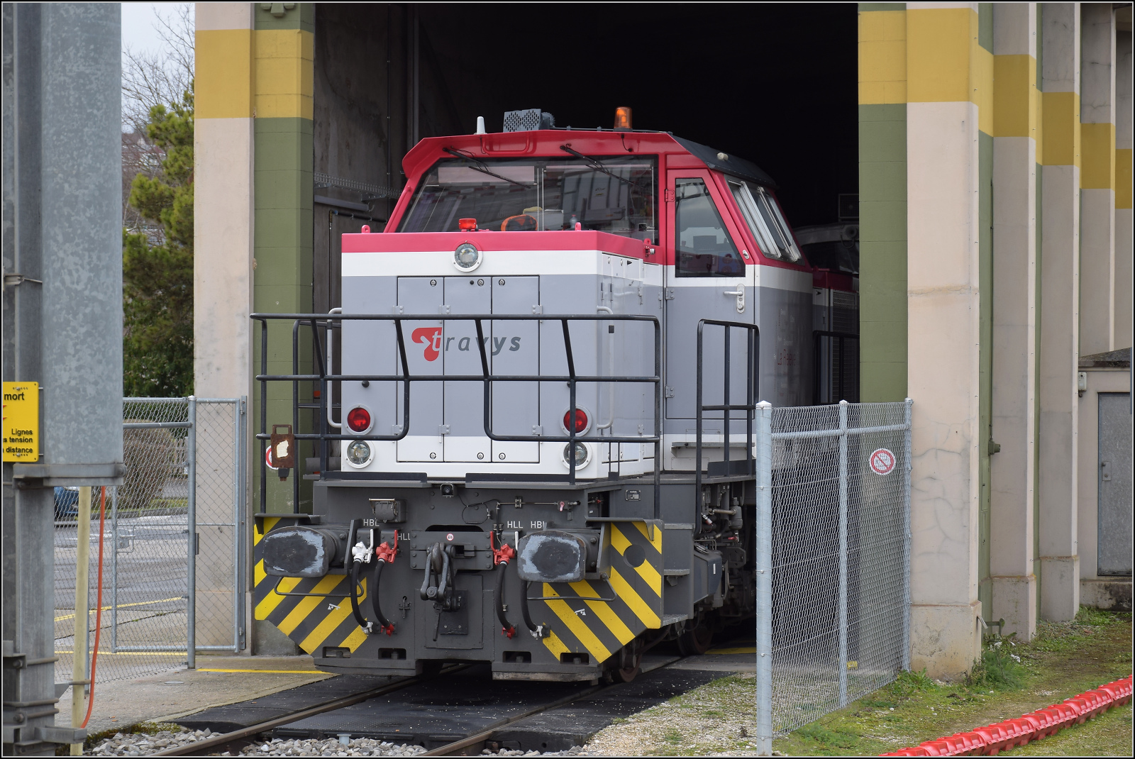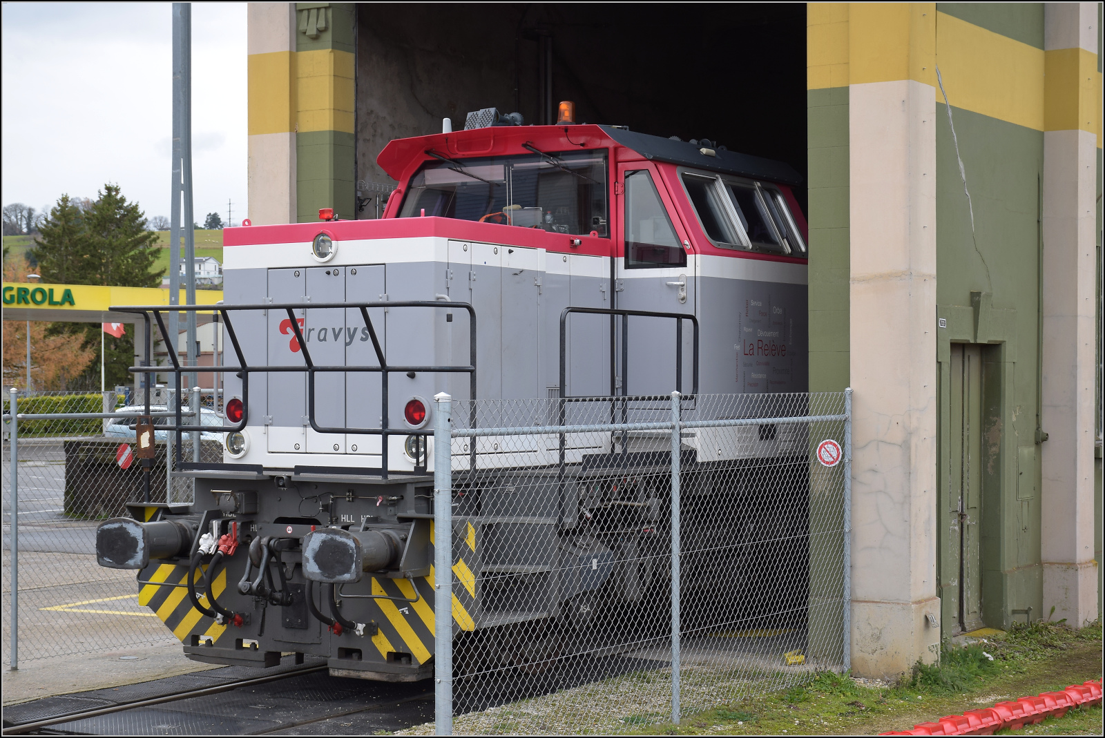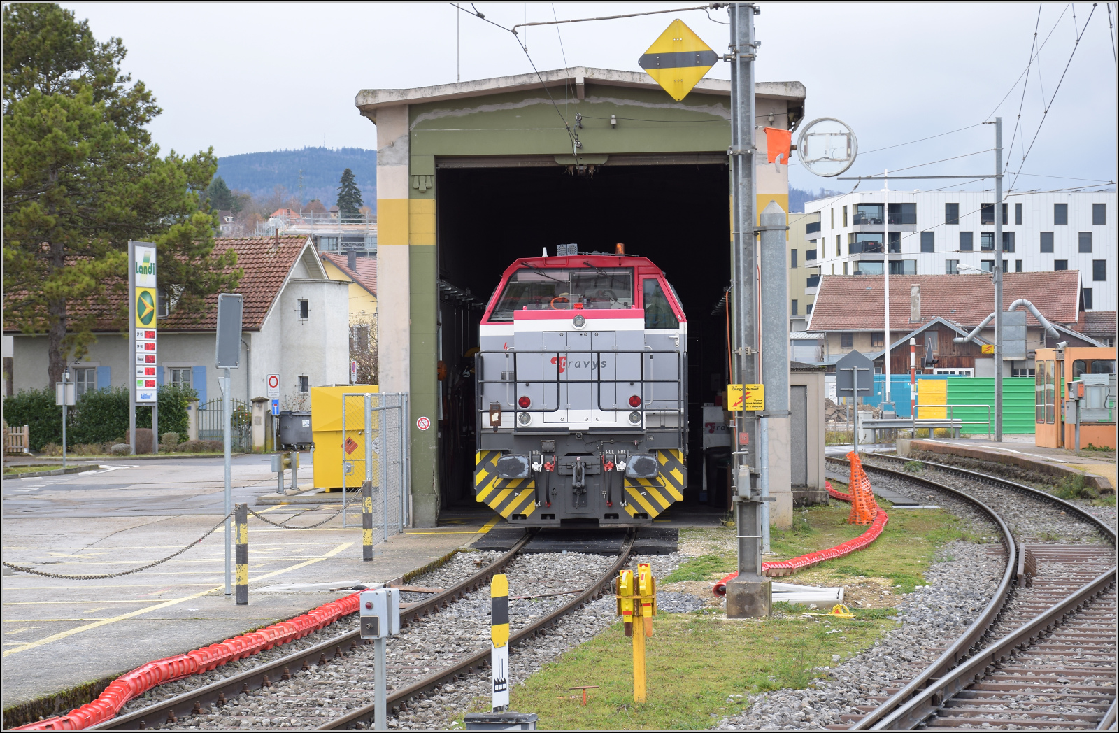 Am 842 705 ist eine G 1000 BB von Vossloh und wurde ursprünglich 2004 an die Raffinerie in Collombey geliefert. Nach der Schließung der Raffinerie wurde sie an die Travys verkauft, die für den Gleichstrombetrieb der übernommenen OC offenbar wenig Verständnis hatte. So wurde der Güterverkehr auf der kurzen Stichstrecke delektrifiziert. Orbe, Dezember 2025. km0