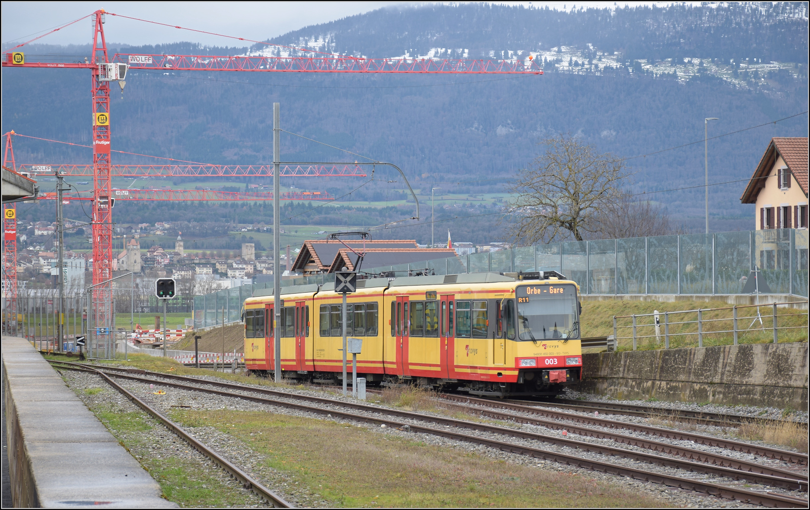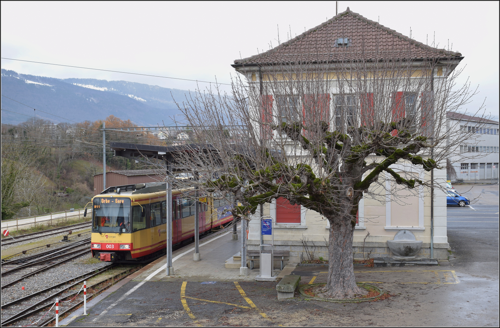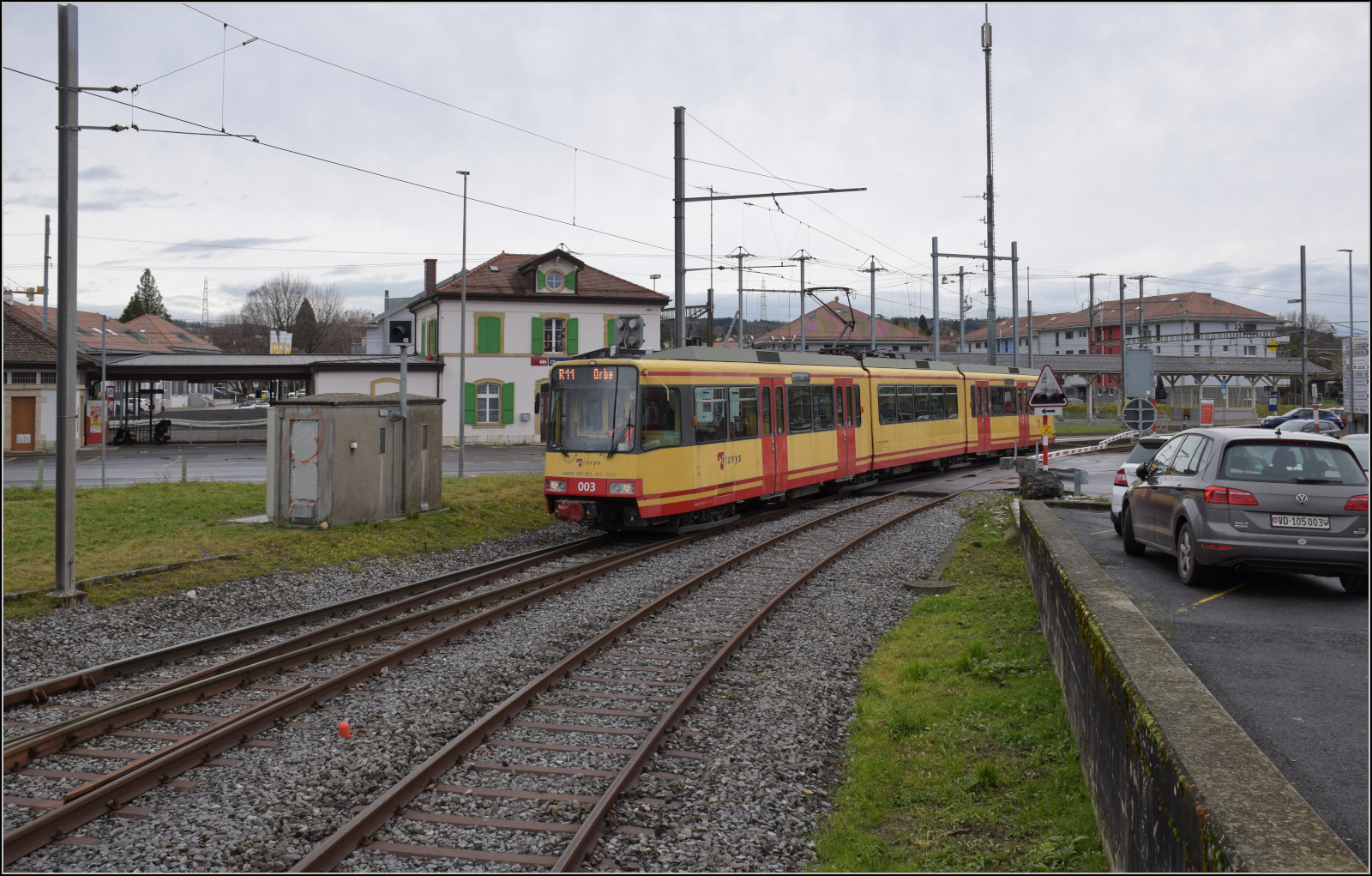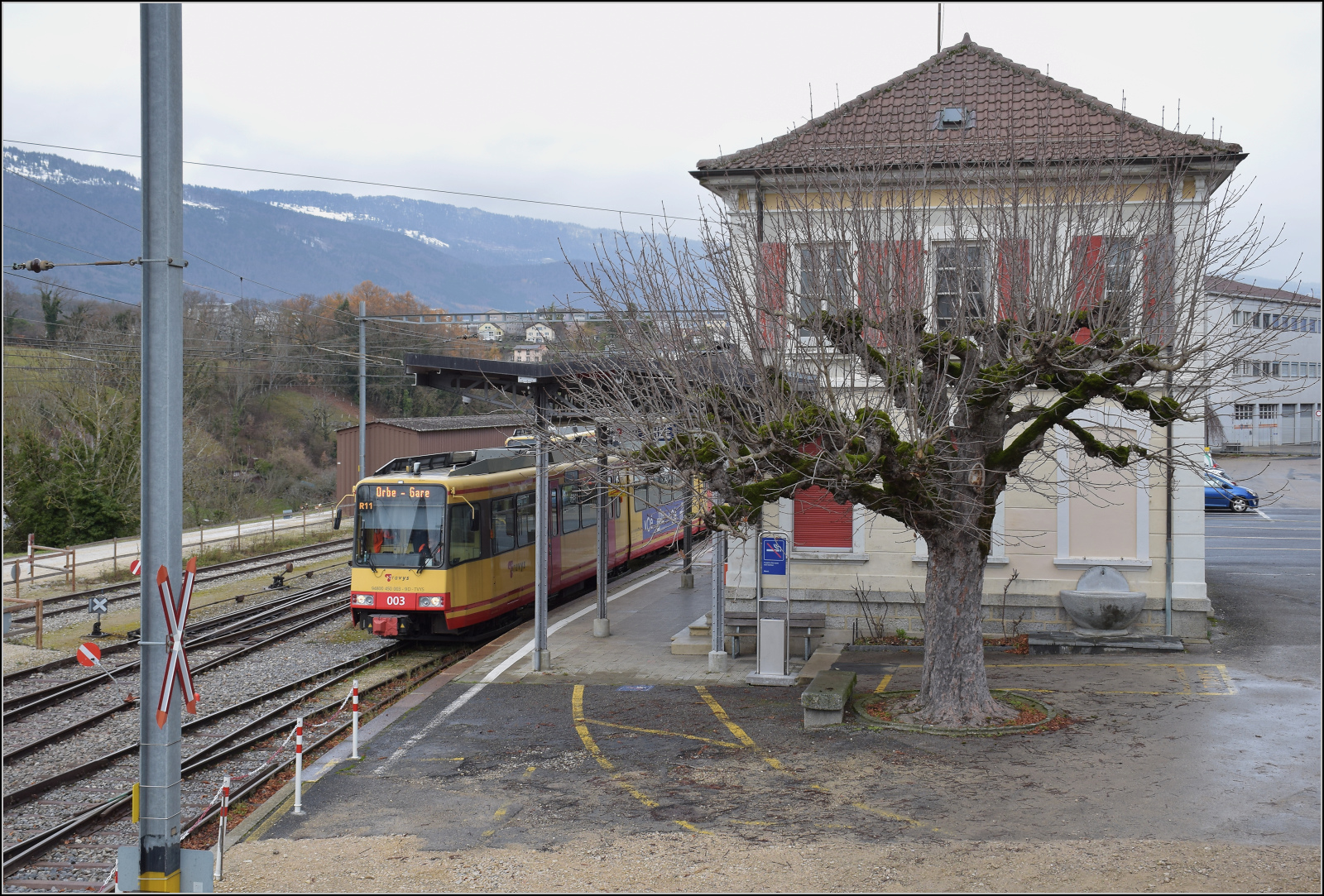 Die Strassenbahn "Be 4/8 003" alias 94 800 450 003-9 D-TVYS wartet in Orbe auf die nächste Ausfahrt nach Chavornay, um die Fahrgäste von den S-Bahnen dort abzuholen. Dezember 2025. km0