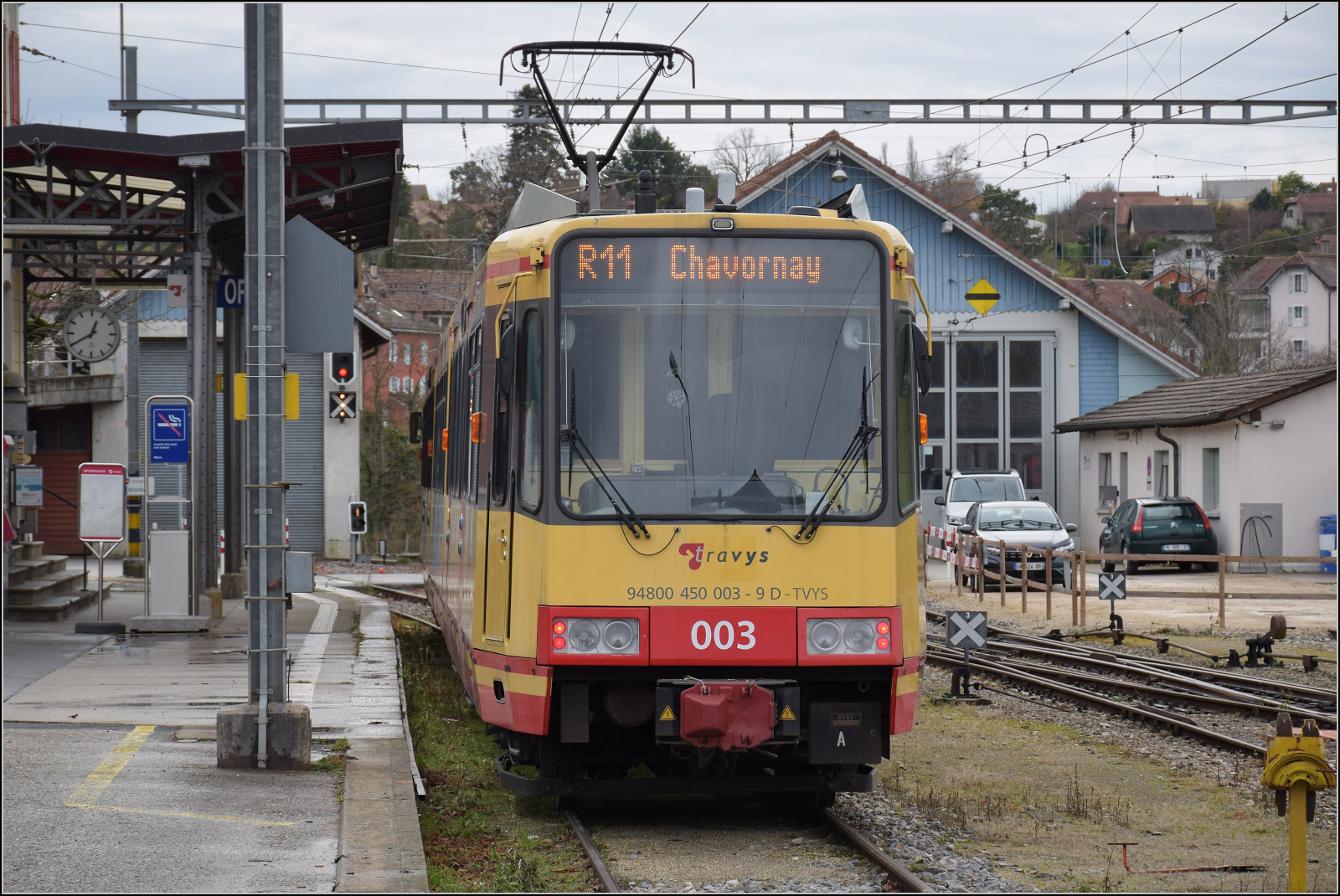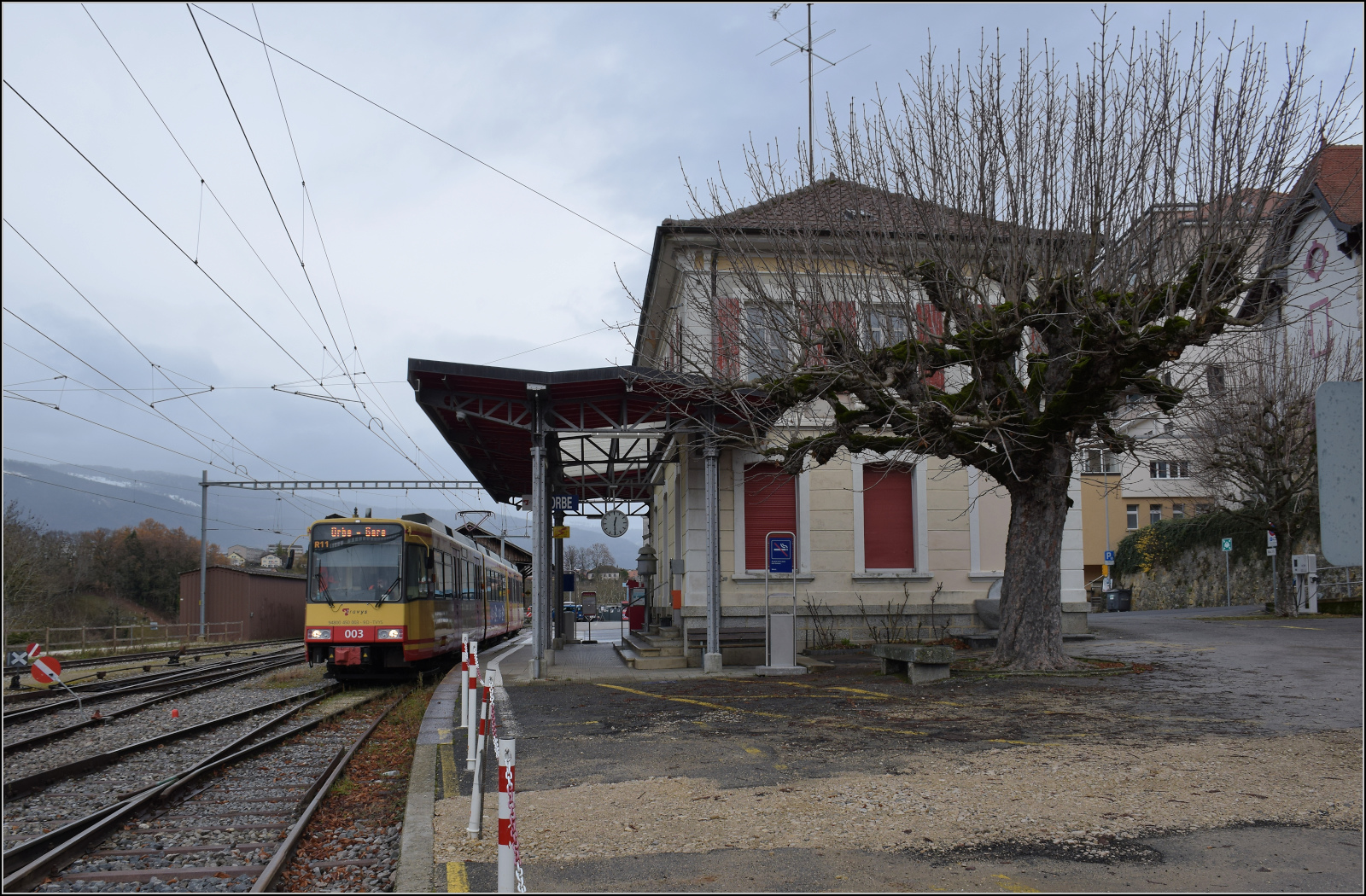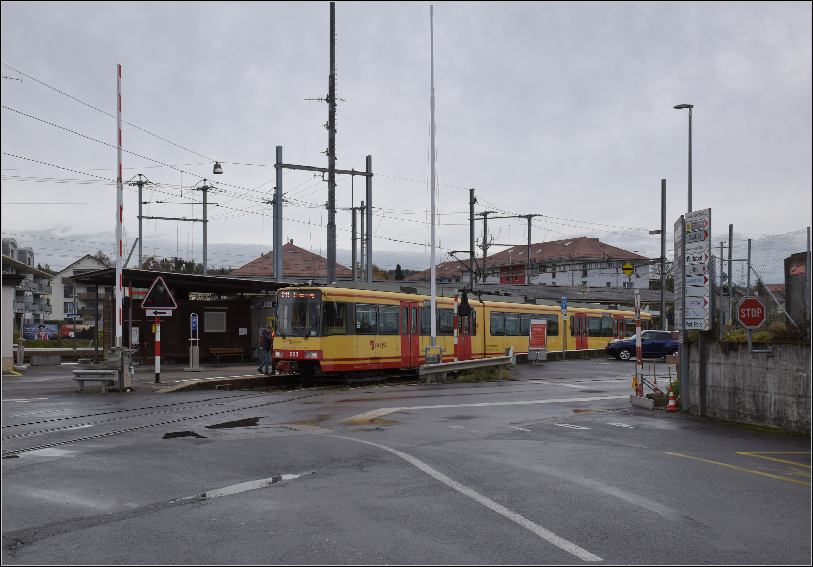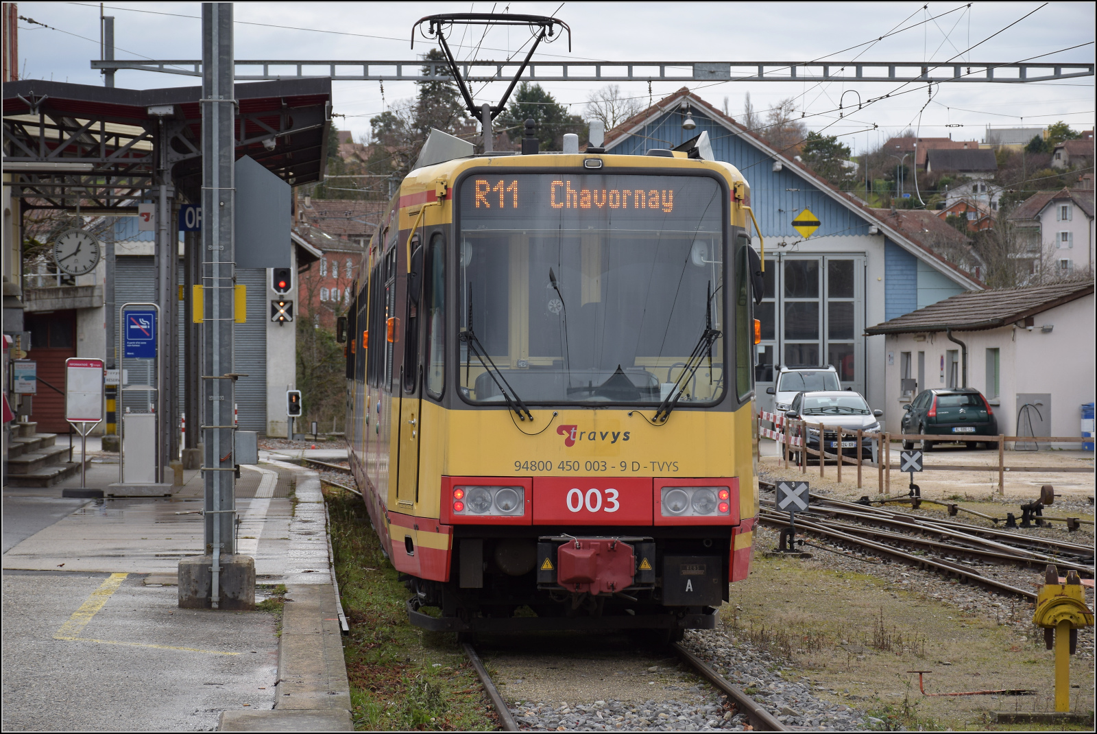 Die Strassenbahn "Be 4/8 003" alias 94 800 450 003-9 D-TVYS wartet in Orbe auf die nächste Ausfahrt nach Chavornay, um die Fahrgäste von den S-Bahnen dort abzuholen. Dezember 2025. km0