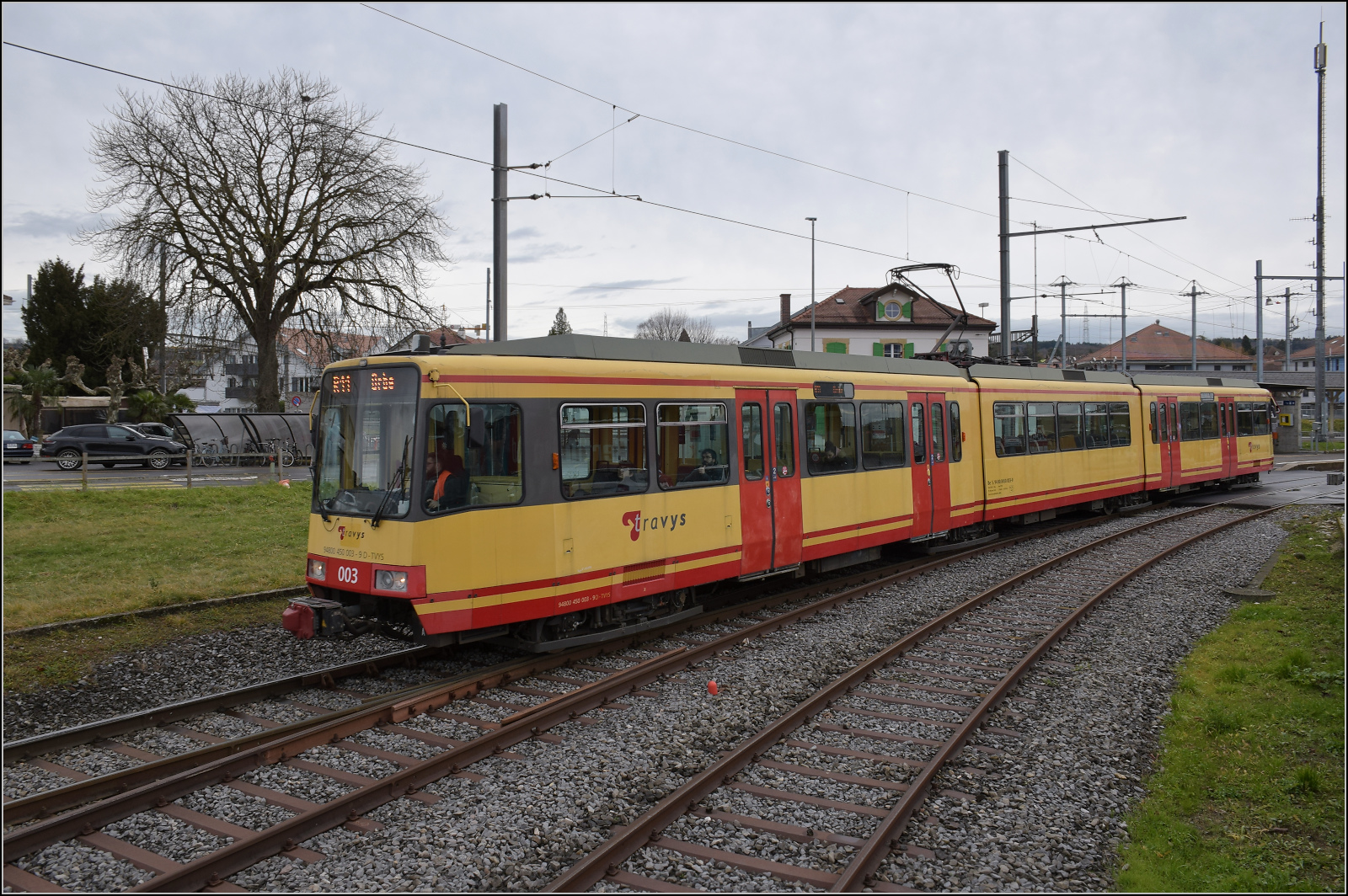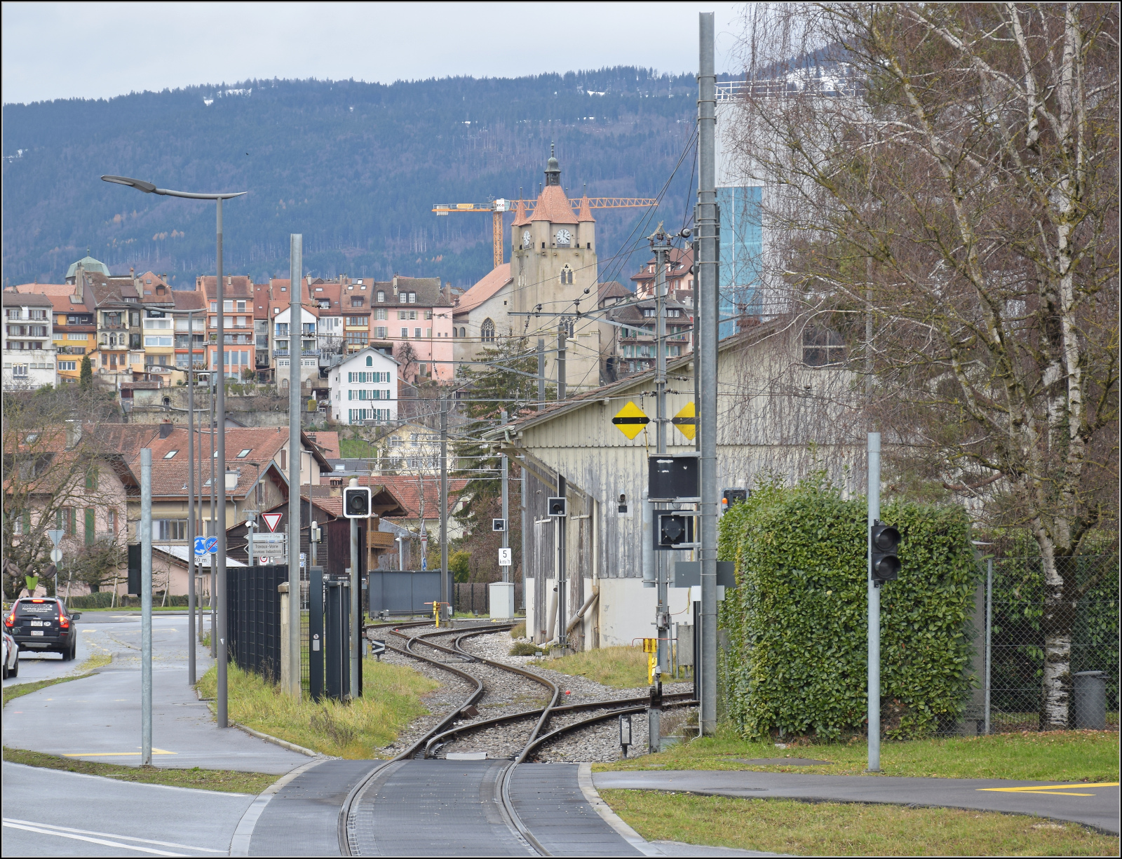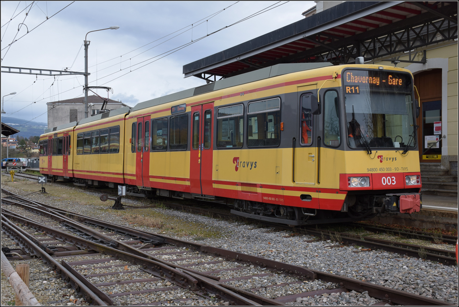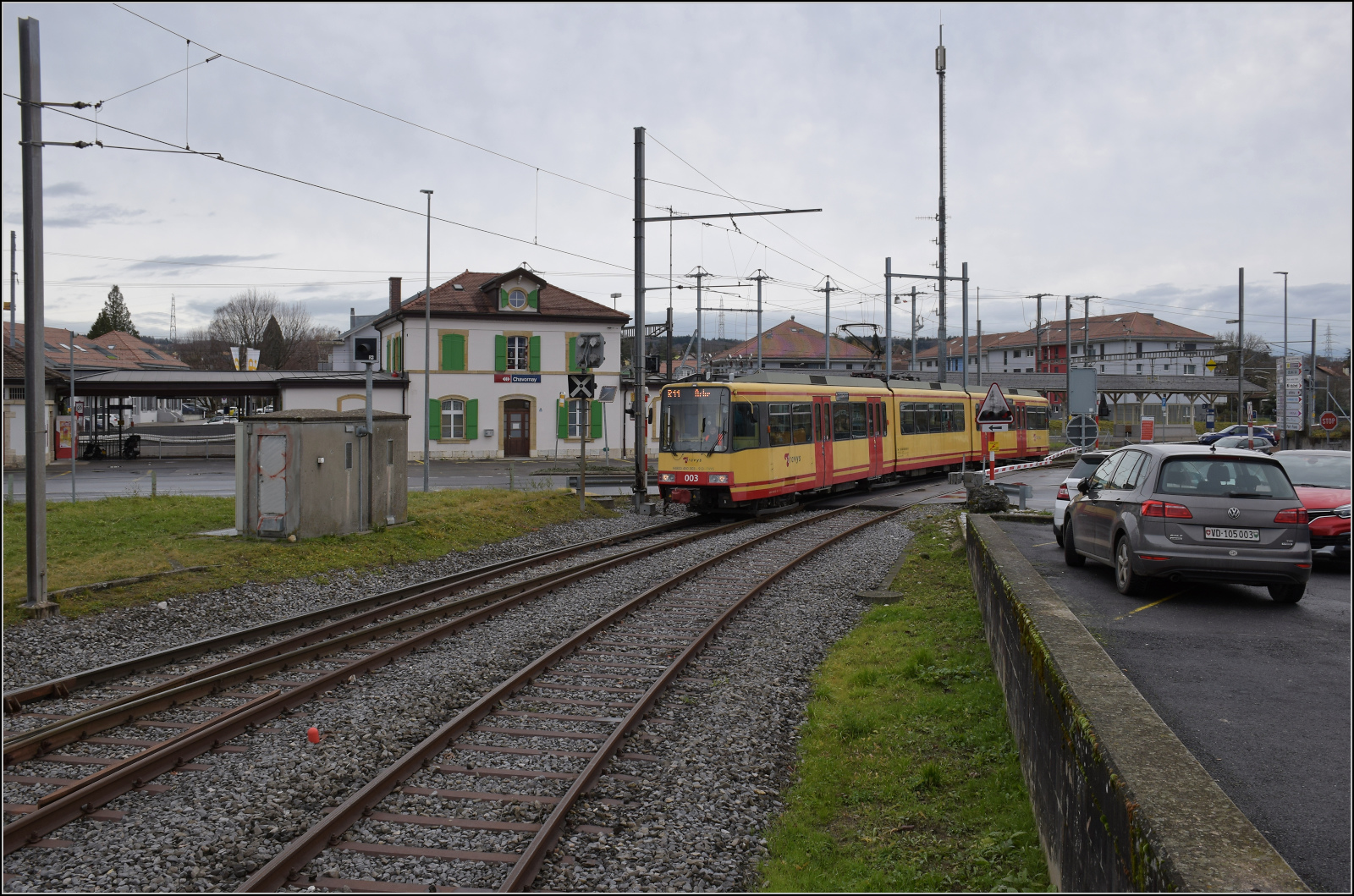 Die Strassenbahn "Be 4/8 003" alias 94 800 450 003-9 D-TVYS wartet in Orbe auf die nächste Ausfahrt nach Chavornay, um die Fahrgäste von den S-Bahnen dort abzuholen. Dezember 2025. km0
