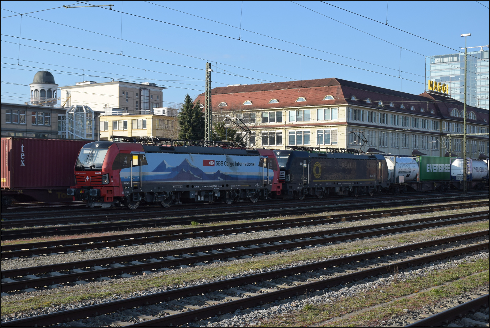 Der Vectron 193 496 der Hupac im BLS-Gewand wartet in Singen auf die Abfahrt seines Containerzuges. April 2026.