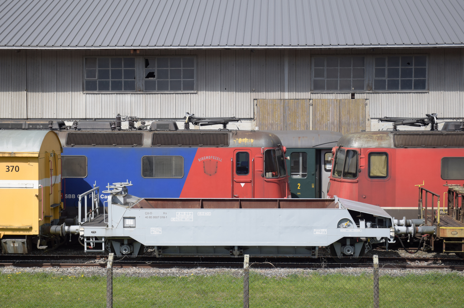 Der schwere Umbaustahlwagen CH-DDF 55 85 89-29 102-7 WR SchwererStahlwagenUmbau steht in der Lokreihe beim Dampflokdepot Full. April 2026.