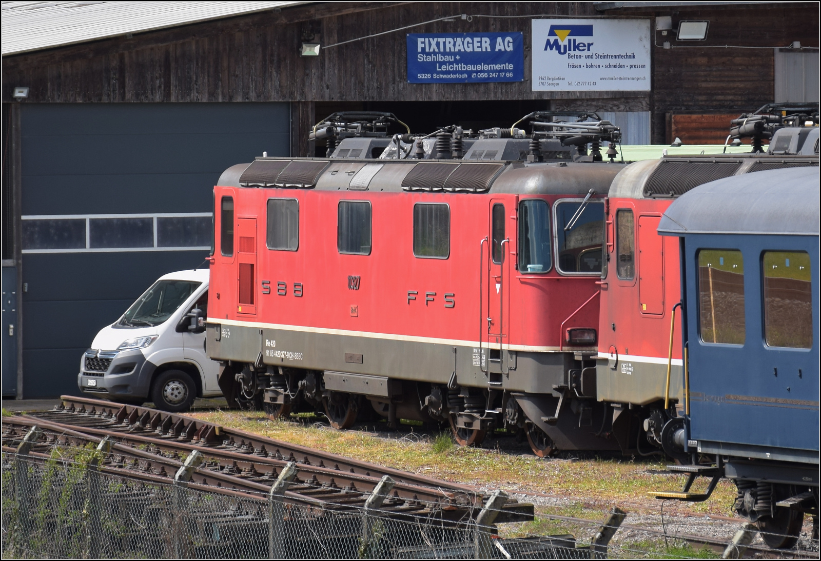 Re 4/4 II 11327 steht in der Lokreihe beim Dampflokdepot Full. April 2026.