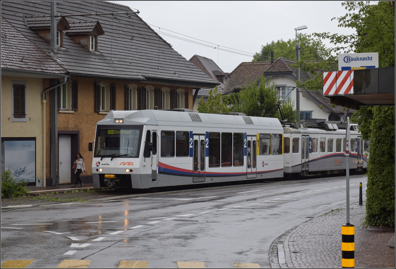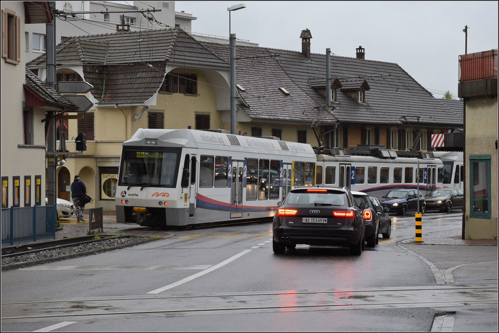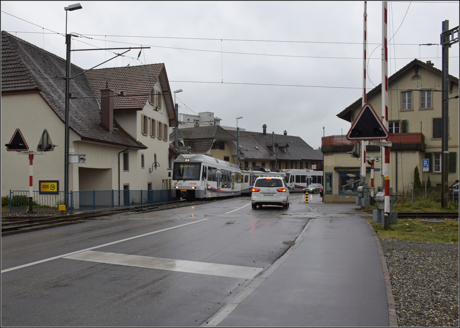 Be 4/4 20 mit Steuerwagen ABt 61 und einer weiteren Fahrzeuggarnitur können nun über die Kreuzung am Bahnübergang fahren. Oberentfelden, August 2017. km0