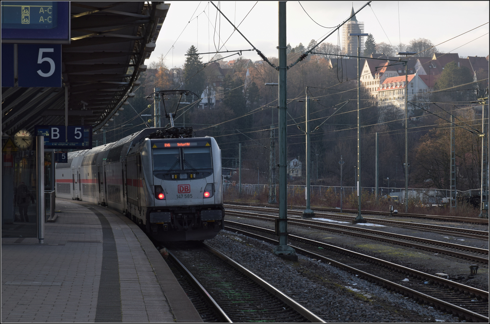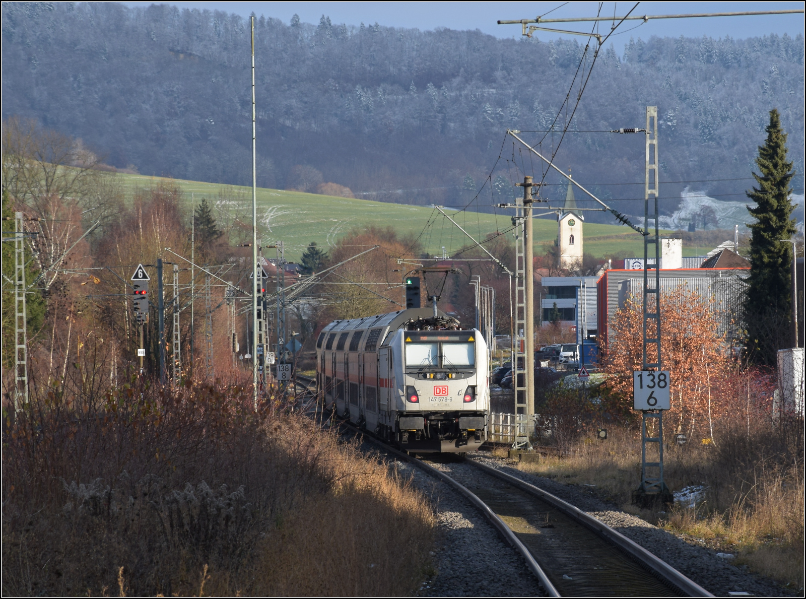 Da kommt mit dem IC2 4907 und 147 589 eine ungewöhnliche Fuhre daher im Rheintal nach Basel. Oktober 2025.