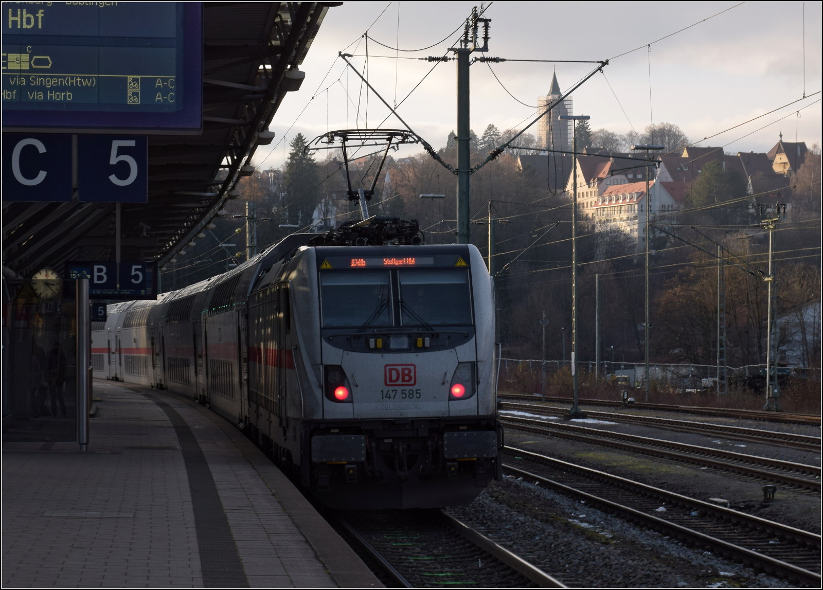 Richtungswechsel für IC2 4906 in Singen. 147 591 senkt den vorderen Schweizer Stromabnehmer. August 2025.
