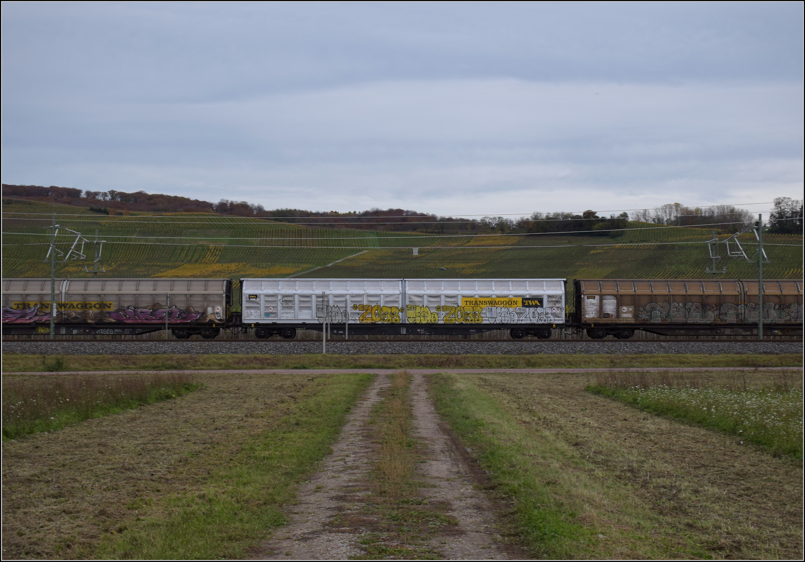 Herbst in Auggen. 185 086 mit vielen Schiebewandwagen nach Norden. Im Bild leuchtet der Wagen 23 80 2743 799-1 von TWA. Oktober 2025.