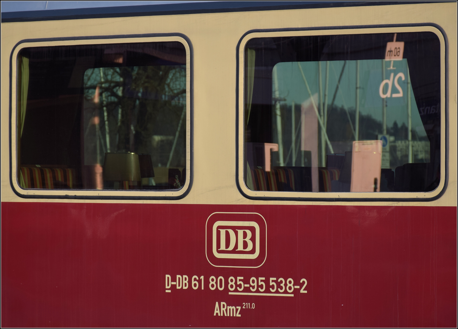 Wagen 5 ist ein ARmz 211.0, 61 80 85-95 538-2. Speiseraum ist angeschrieben. Diese Wagen sind mit 27,5 m besonders lang und wurden nach Entgleisungen in Stuttgart schnell abgestellt. Ursprünglich war der Wagen rot und blau wegen der drei Erstklassabteile lackiert, was ihm den Spitznamen Kakadu einbrachte. Wegen der verlängerten TEE-Abteile könnte man ihn den vm-Wagen zuordnen. November 2025. km0