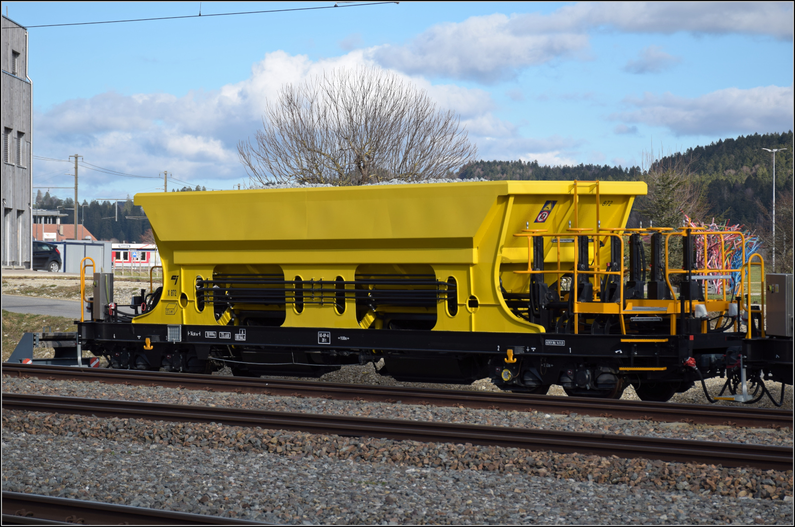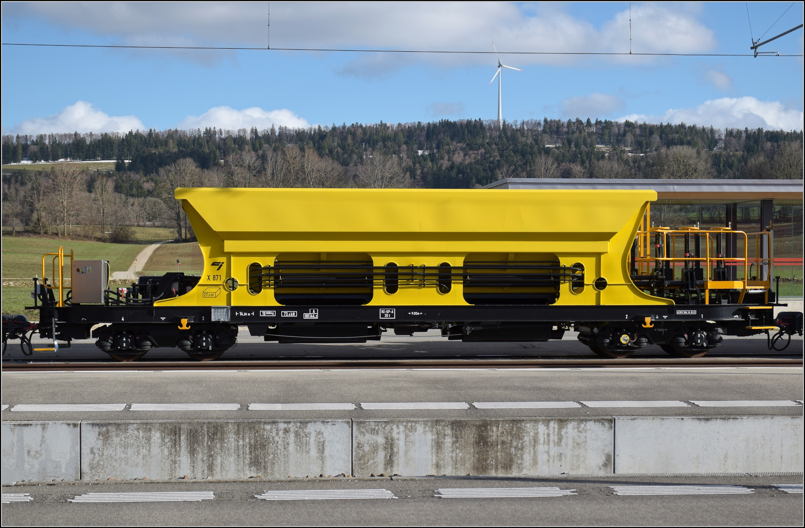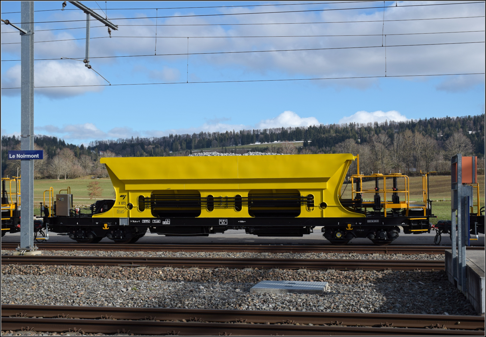 Neubaugüterwagen der CJ. Nur drei Jahre alt sind die Flachwagen X 862 und X 863. Im Hintergrund sind die Festhallen des Chant du Gros-Festival in Le Noirmont zu sehen. August 2024. km0