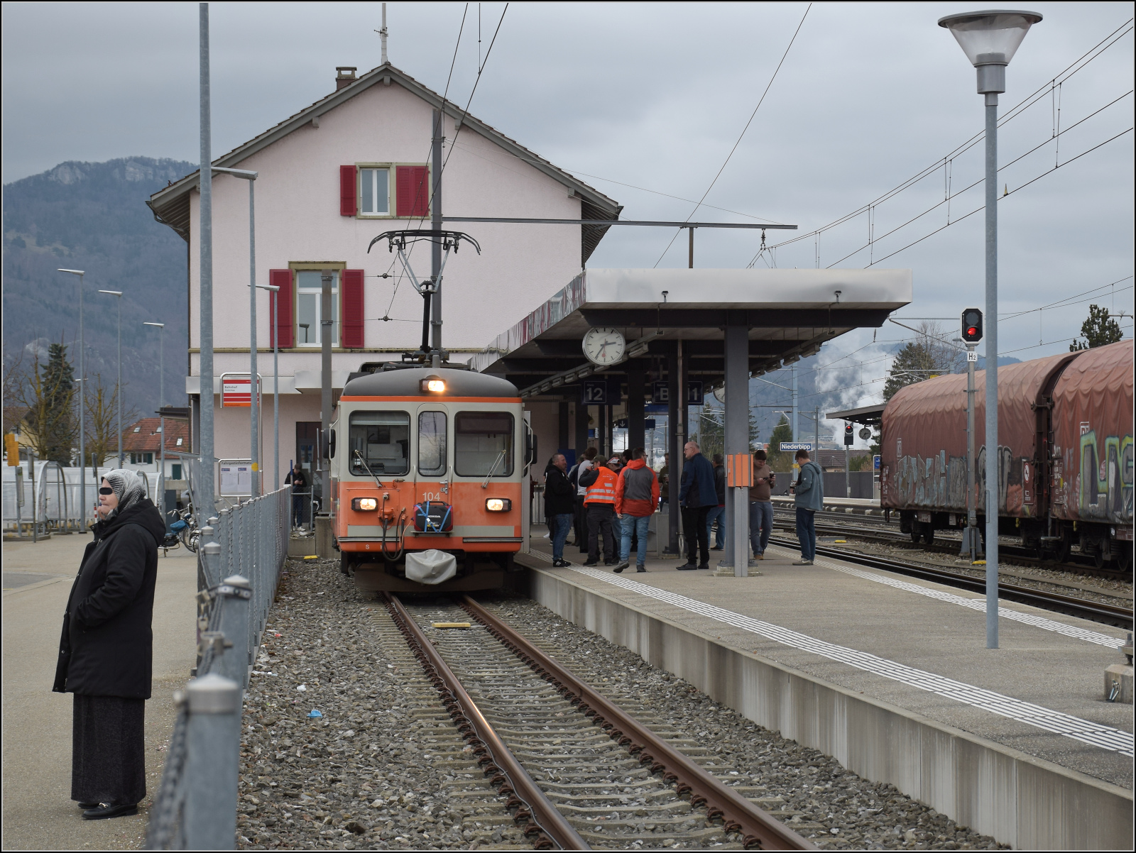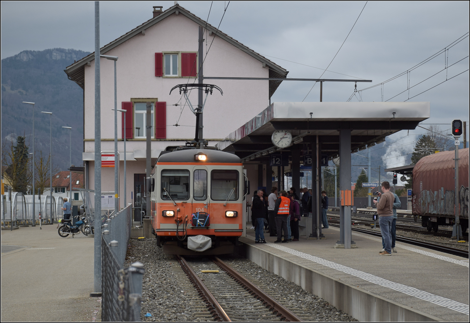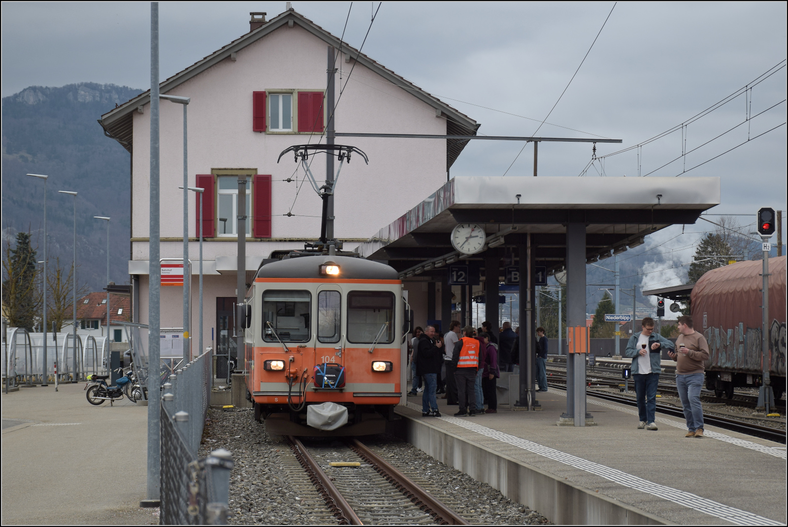 Be 4/4 104 daheim in Niederbippm dem namensgebenden Ort der Strecke und sogar im passenden Stumpfgleis. Februar 2026.