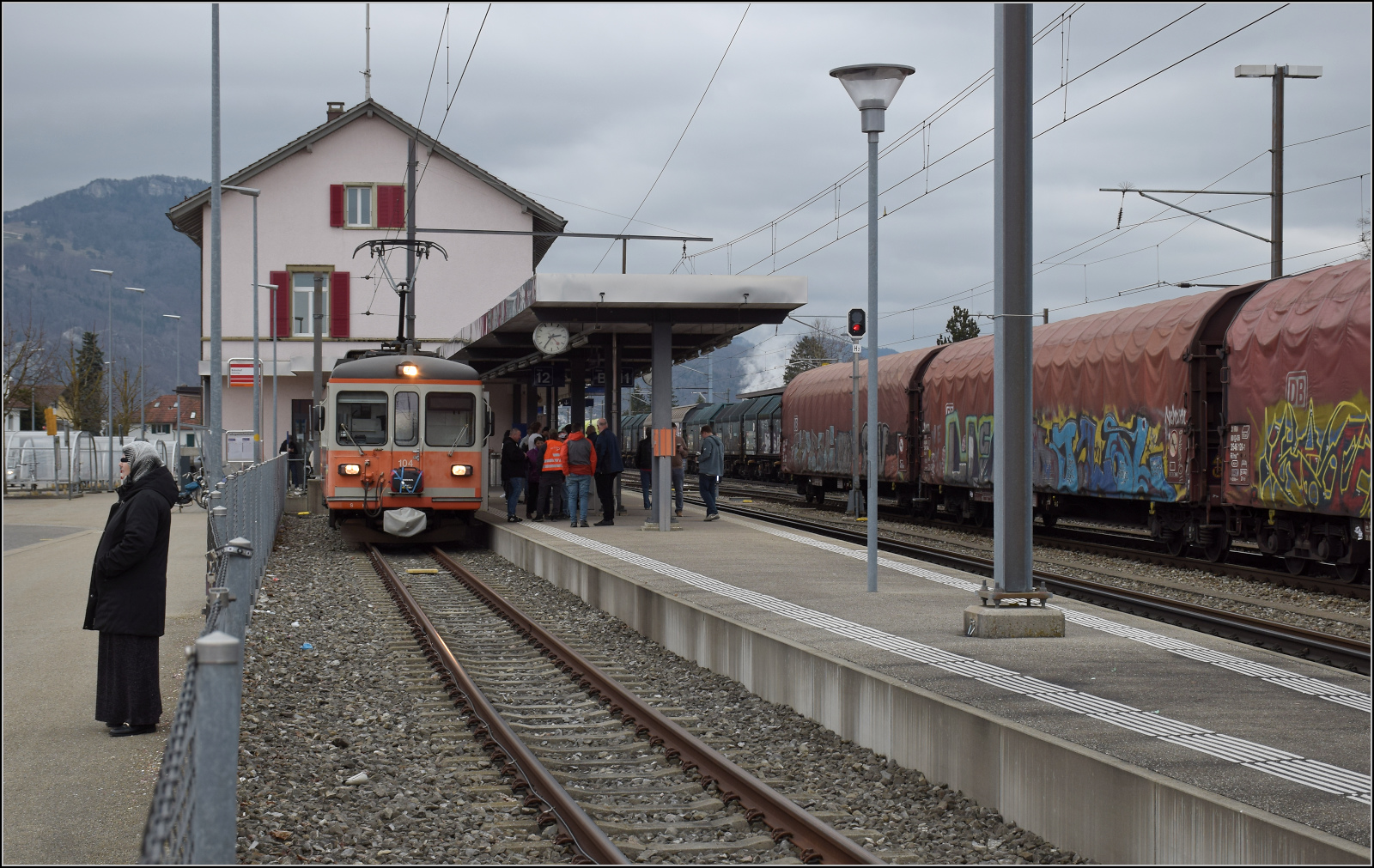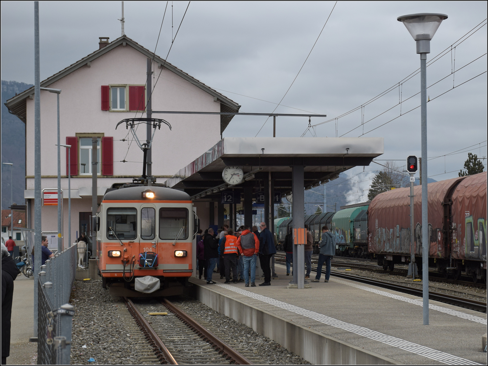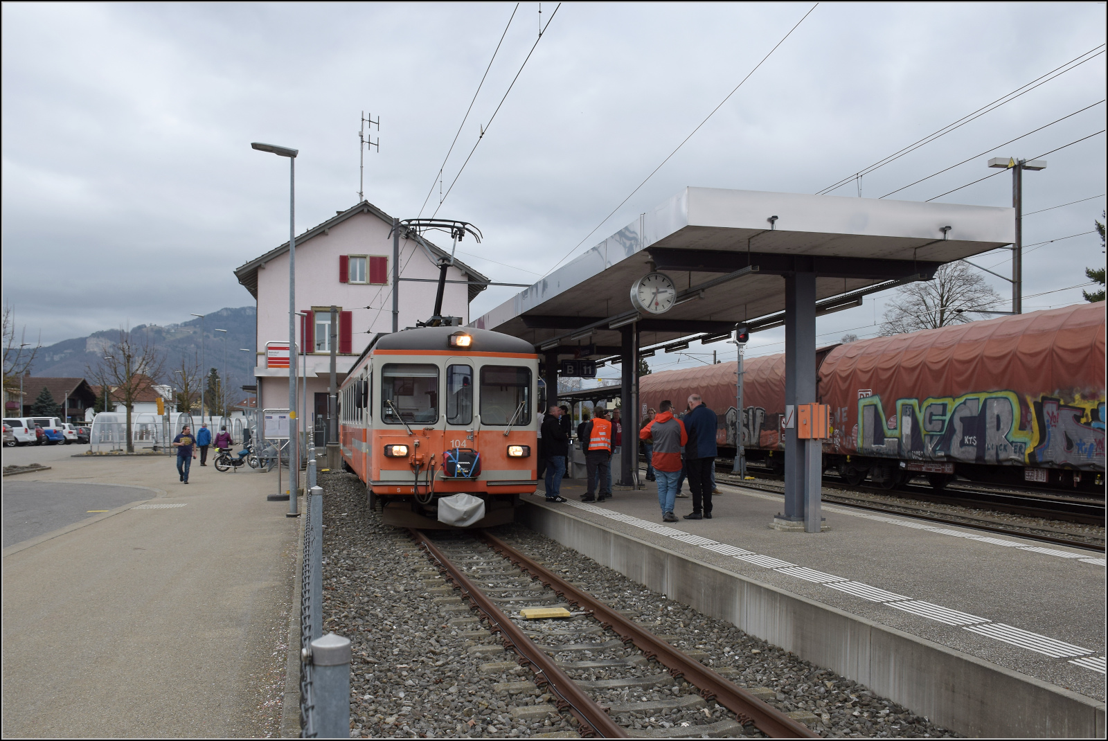 Be 4/4 104 daheim in Niederbippm dem namensgebenden Ort der Strecke und sogar im passenden Stumpfgleis. Februar 2026.