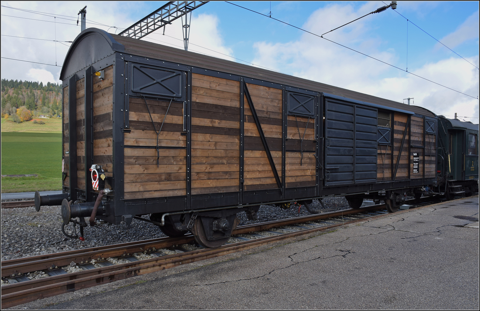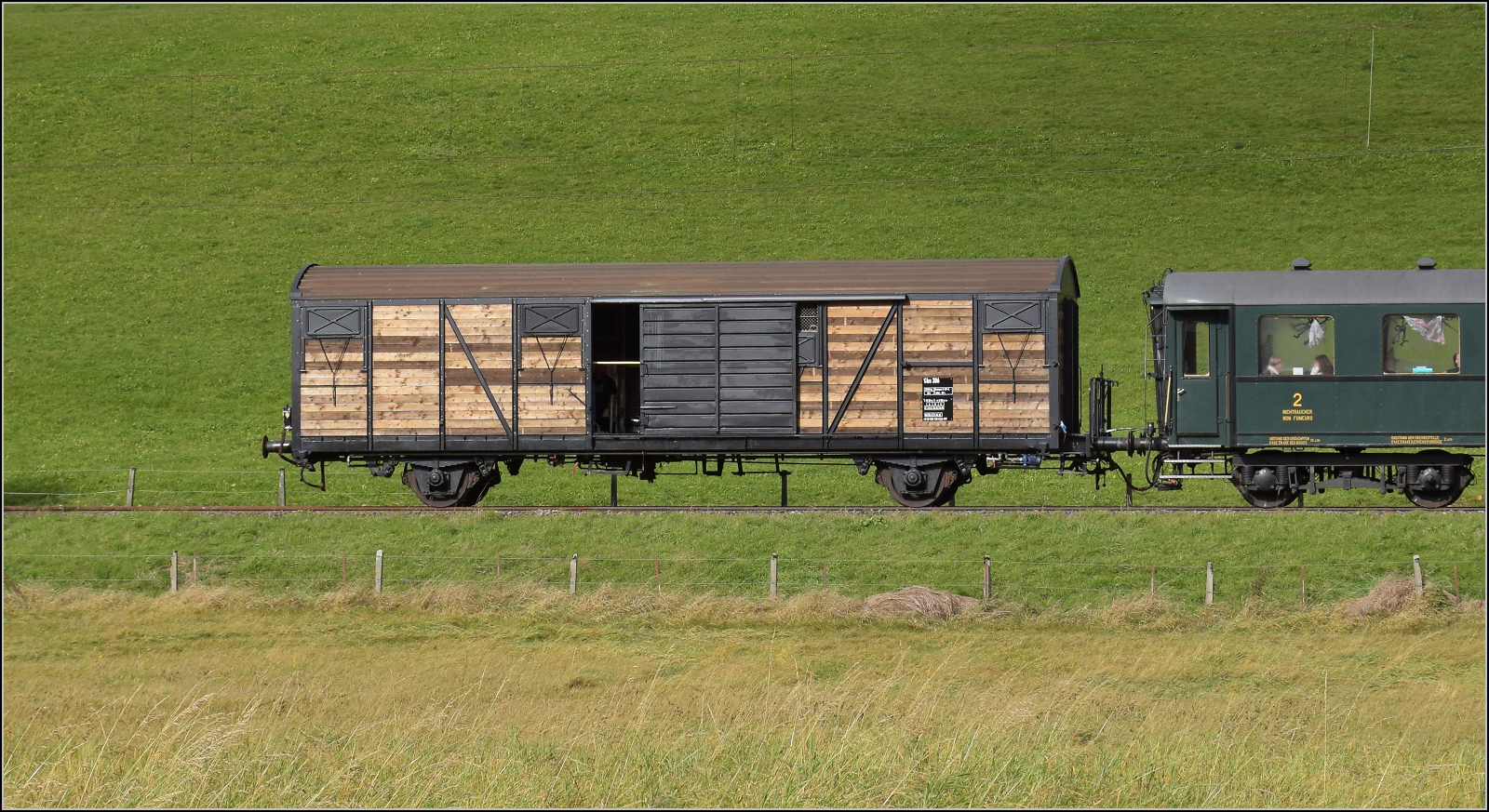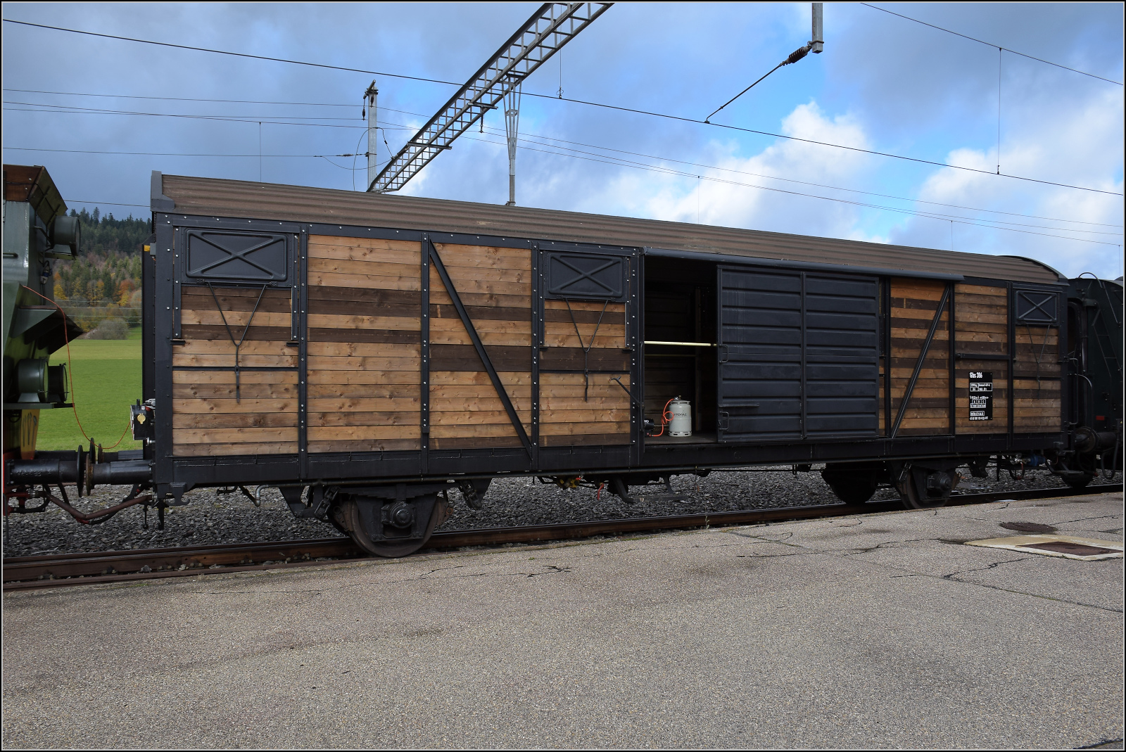 Der Brauereiwagen Pc OG 1 'Feldschlösschen' wurde 1898 von der SIG Neuhausen an die Nordostbahn geliefert und wurde mit der NOB 1902 in die SBB eingegliedert. 1922 erhielt er die Nummer Pc 513 355 und war bis 1967 im Einsatz. Zum DVZO kam er 2010, was ihm sicher nicht nur äusserlich sehr gut getan hat. Hier im Einsatz im GmP mit Ee 3/3 16363. Bauma, September 2025. km0