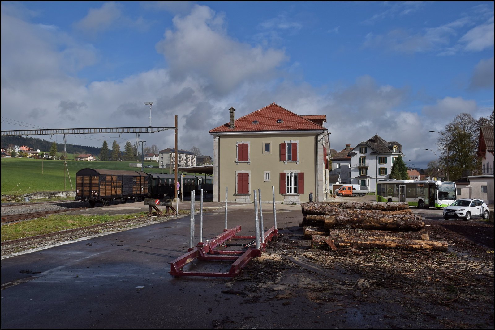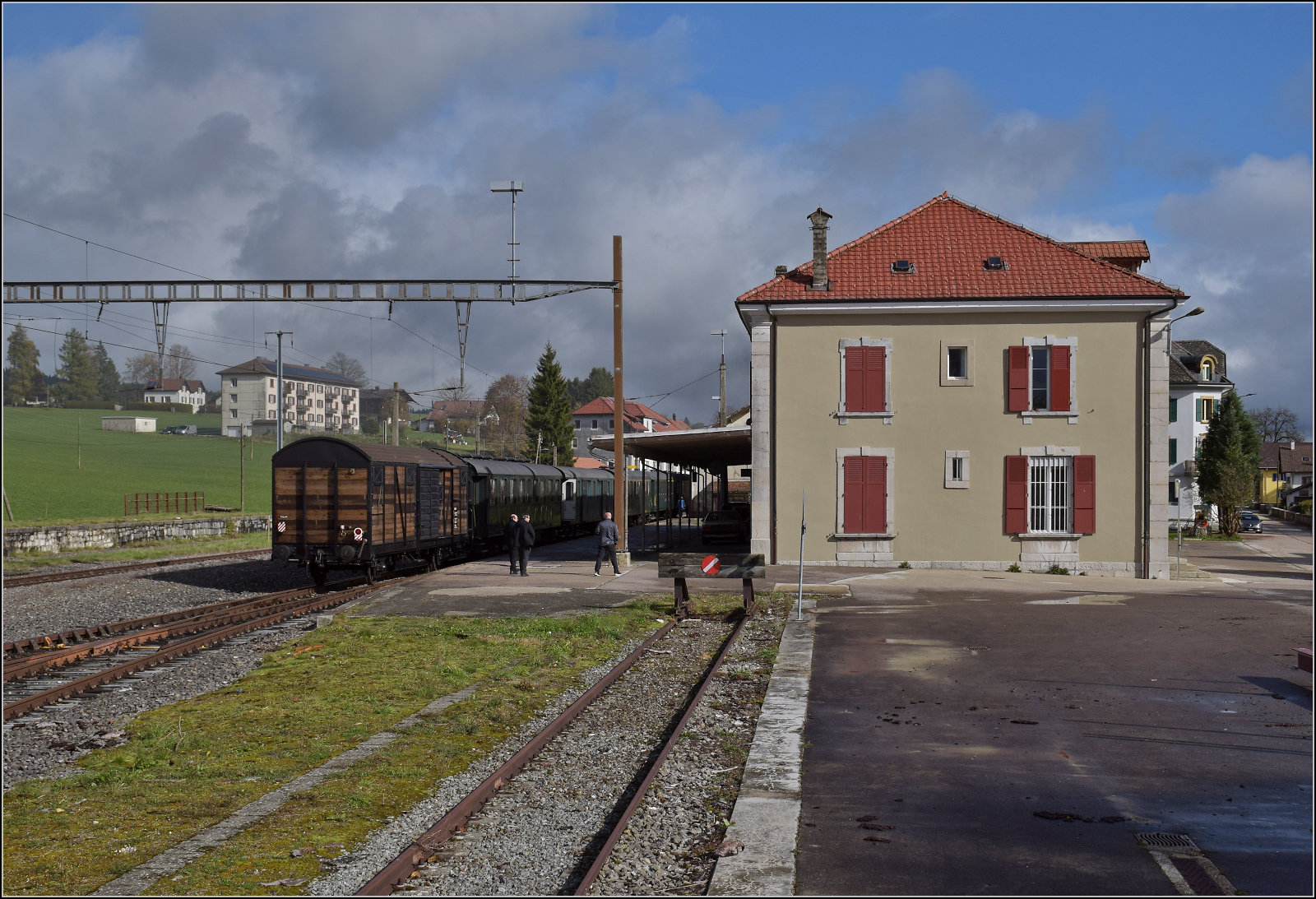 TKp 16 'Śląsk' fährt mit ihrem Halloweenzug ins Val Travers herunter. Am Zugschluss ist Gbs 386, der ganz offensichtlich in einen Jungbrunnen gefallen ist. Fin de Granges, Oktober 2025. km0