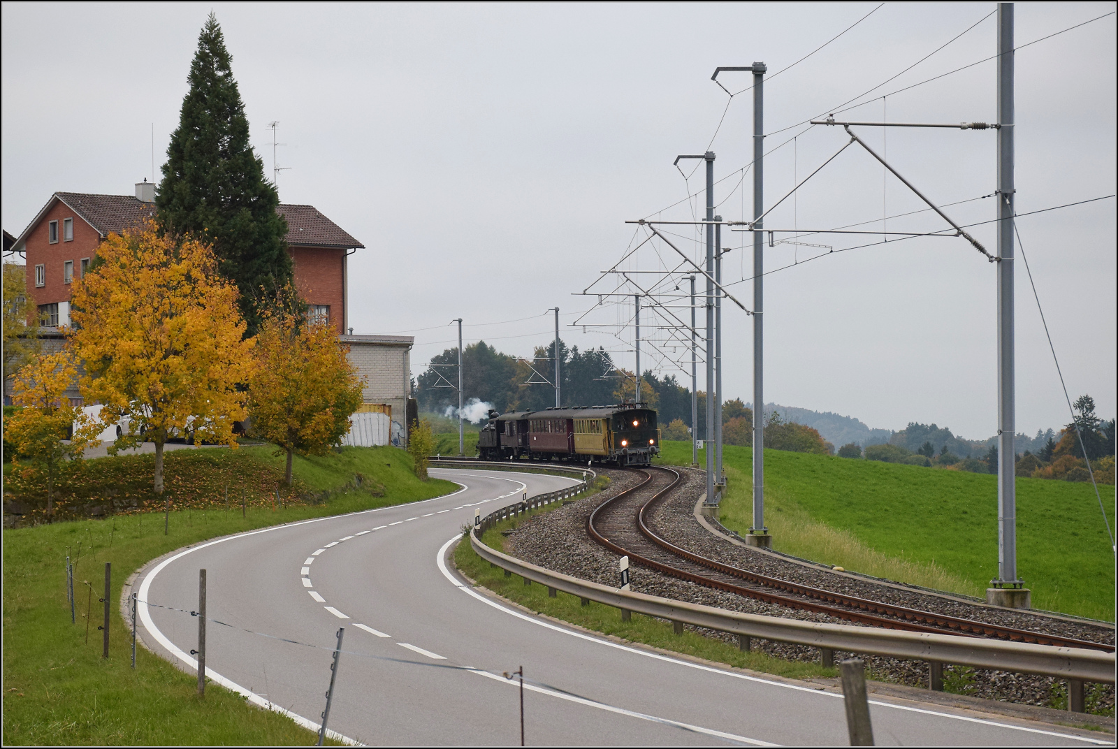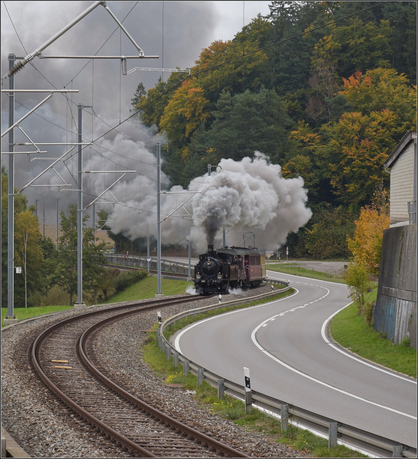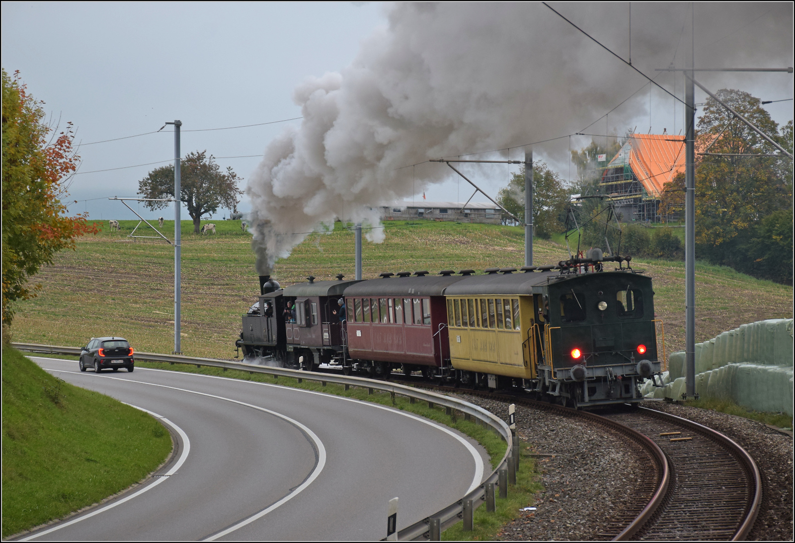 BSB Ed 3/4 51 auf ihrer allerletzten Publikumsfahrt, bevor sie wegen ETCS ein Hausverbot bekommt. Damit es einen echten Pendelzug ergibt, hilft EBT-Rangiertraktor Te 2/2 155 bei der Talfahrt bis Lanzenhäusern, denn dort kann der Zug nicht umfahren werden. Steinhaus, Oktober 2025. km0