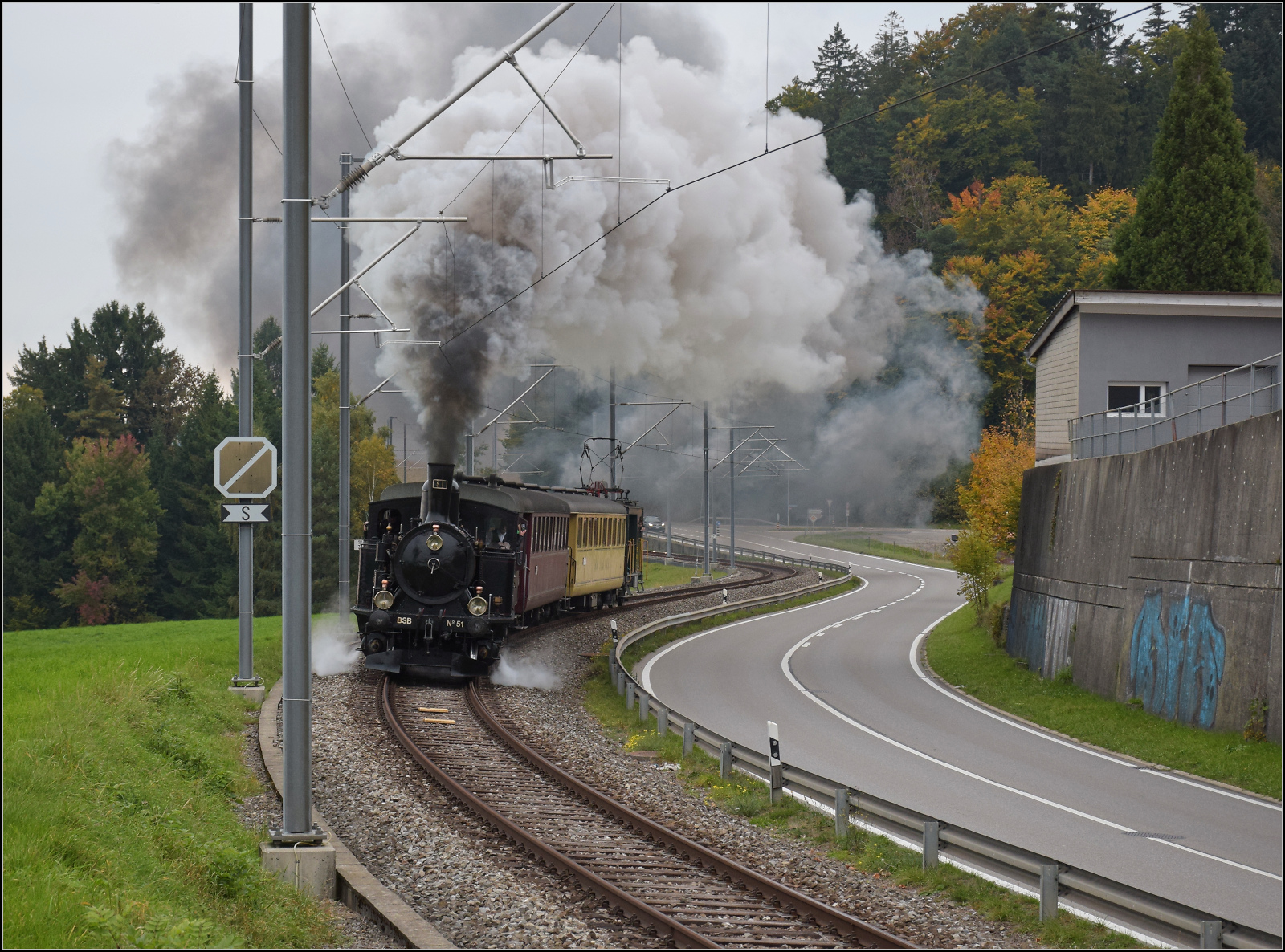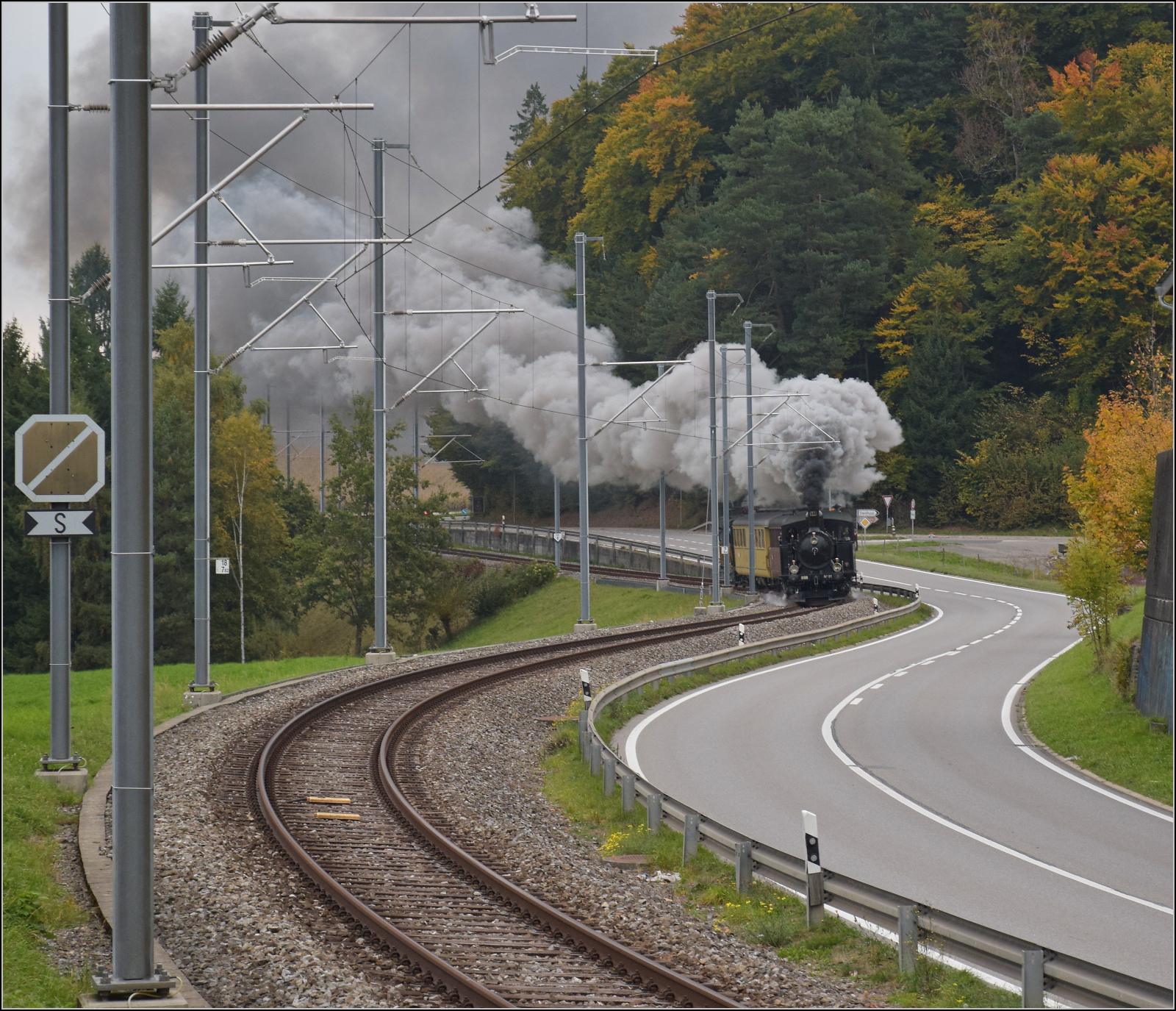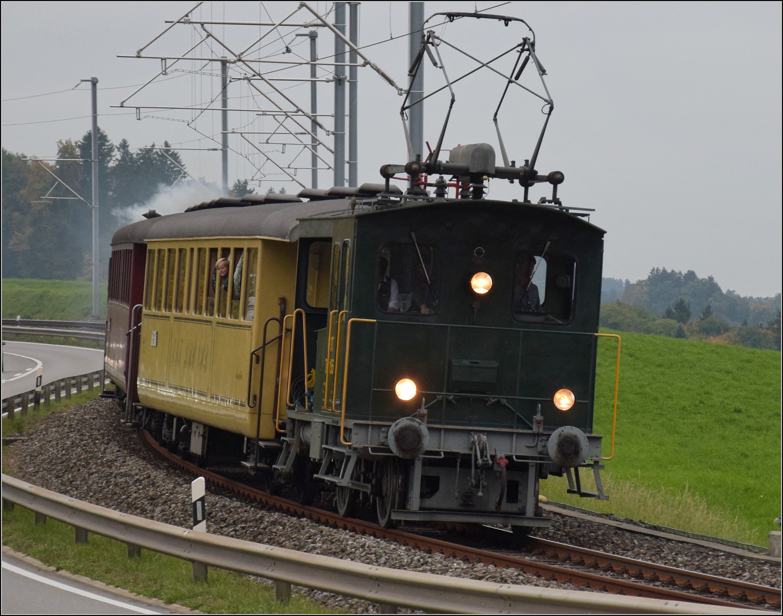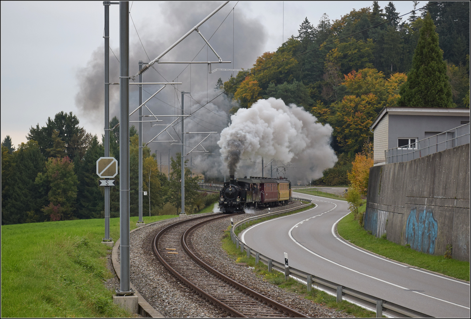 BSB Ed 3/4 51 auf ihrer allerletzten Publikumsfahrt, bevor sie wegen ETCS ein Hausverbot bekommt. Damit es einen echten Pendelzug ergibt, hilft EBT-Rangiertraktor Te 2/2 155 bei der Talfahrt bis Lanzenhäusern, denn dort kann der Zug nicht umfahren werden. Steinhaus, Oktober 2025. km0