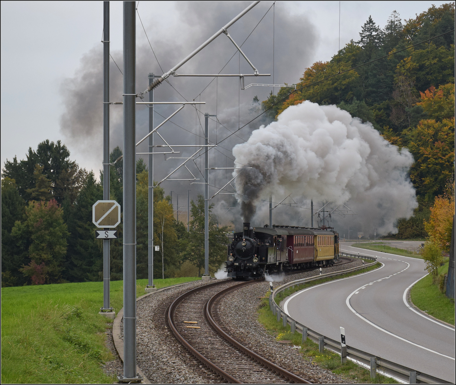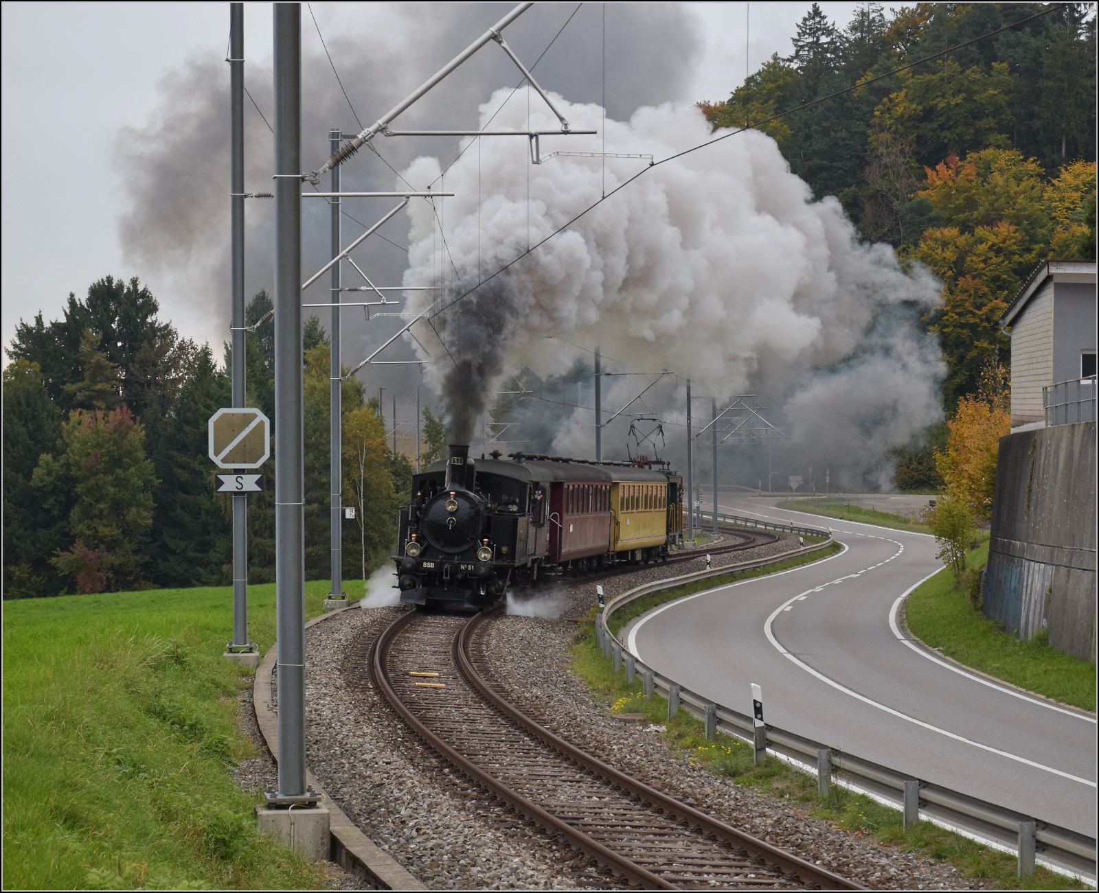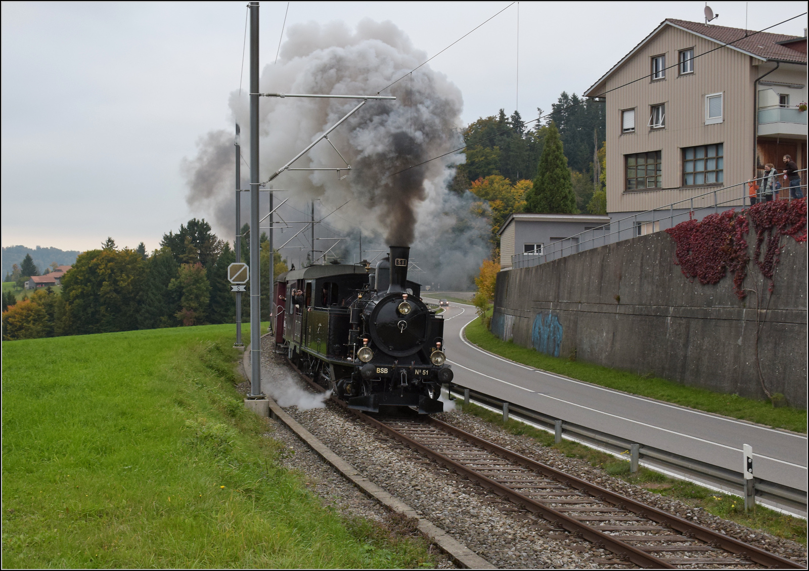 BSB Ed 3/4 51 auf ihrer allerletzten Publikumsfahrt, bevor sie wegen ETCS ein Hausverbot bekommt. Da darf sie noch mal richtig zeigen, was in ihr steckt! Ein letztes Mal aufbäumen, in der Nacht gibt es lediglich noch die relativ geräuschlose Heimreise in ihr Exil nach Konolfingen. Steinhaus, Oktober 2025. km0