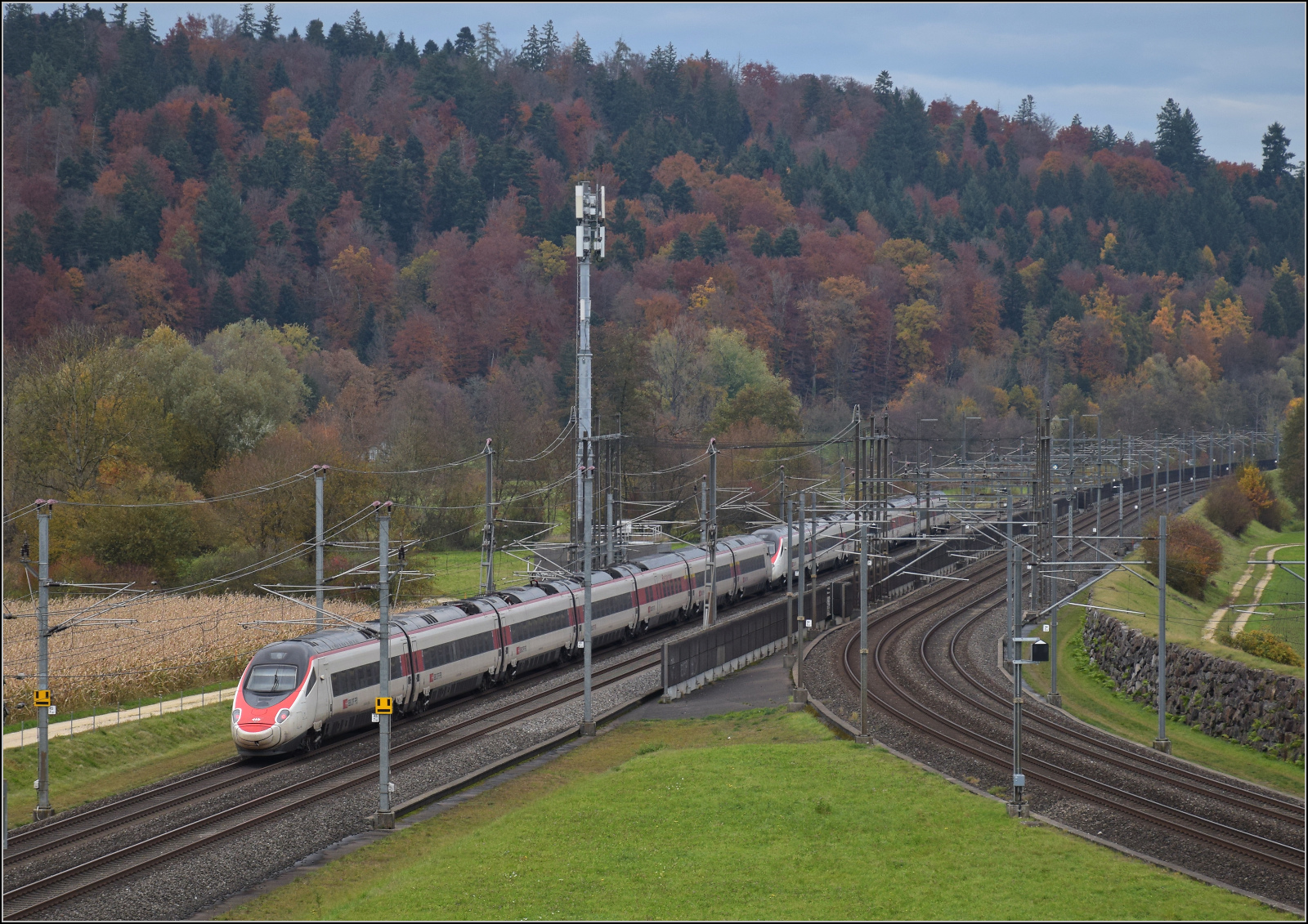 Sonderfahrt mit Be 4/4 102 der Emmentalbahn nach Brugg. Durchfahrt der Kreuzungsstelle dreier Bahnen bei Kaltenherberg. Im Vordergrund sind noch die Gleise der einstigen Langenthal-Melchnau-Bahn, heute eingekürzt der ASm zugehörig. November 2025.