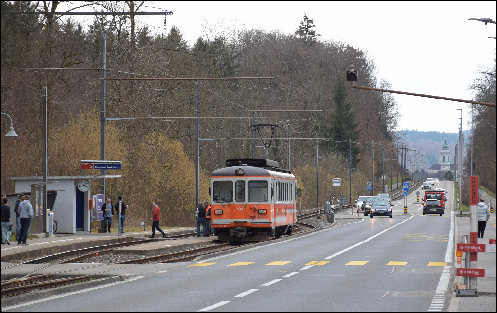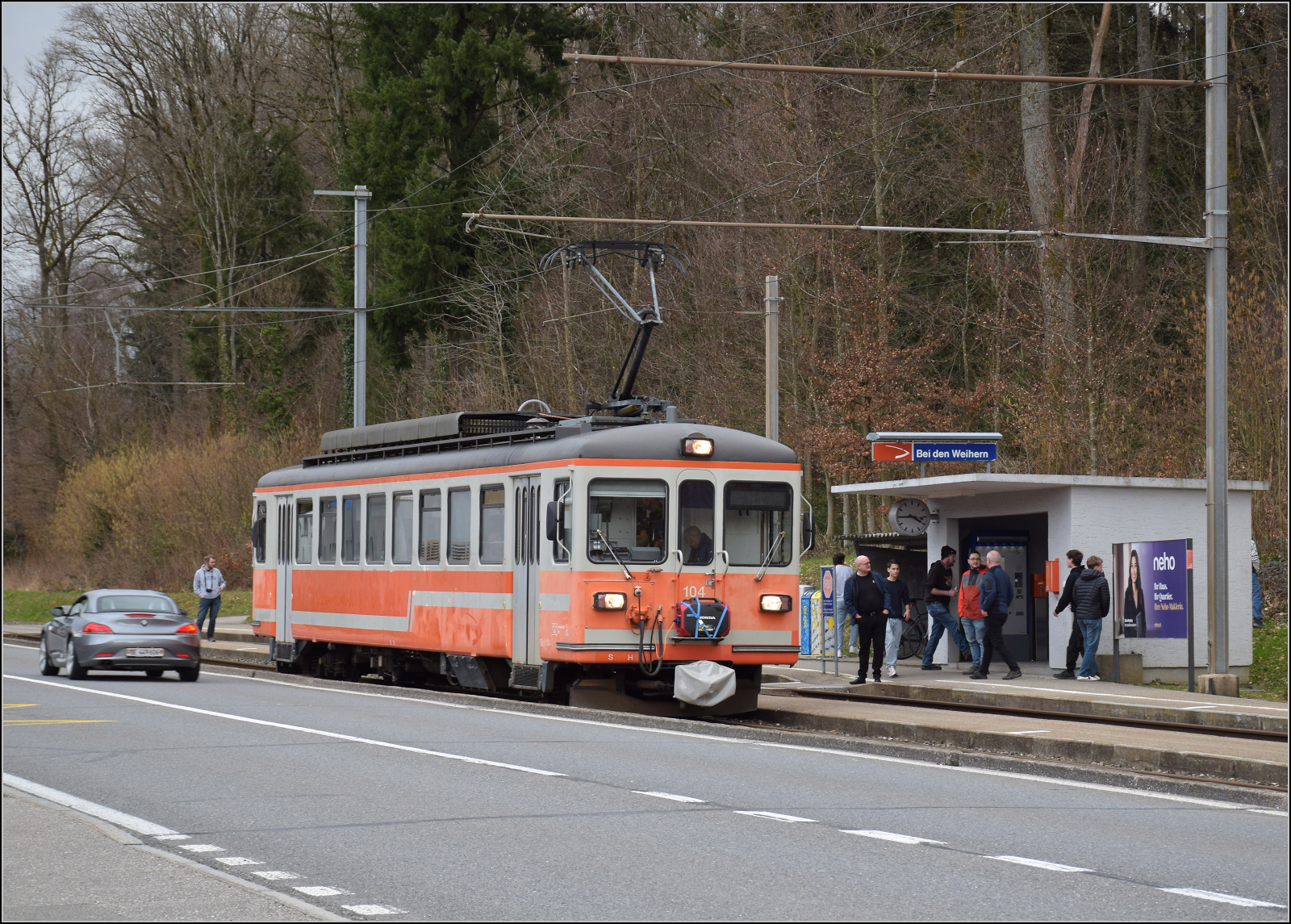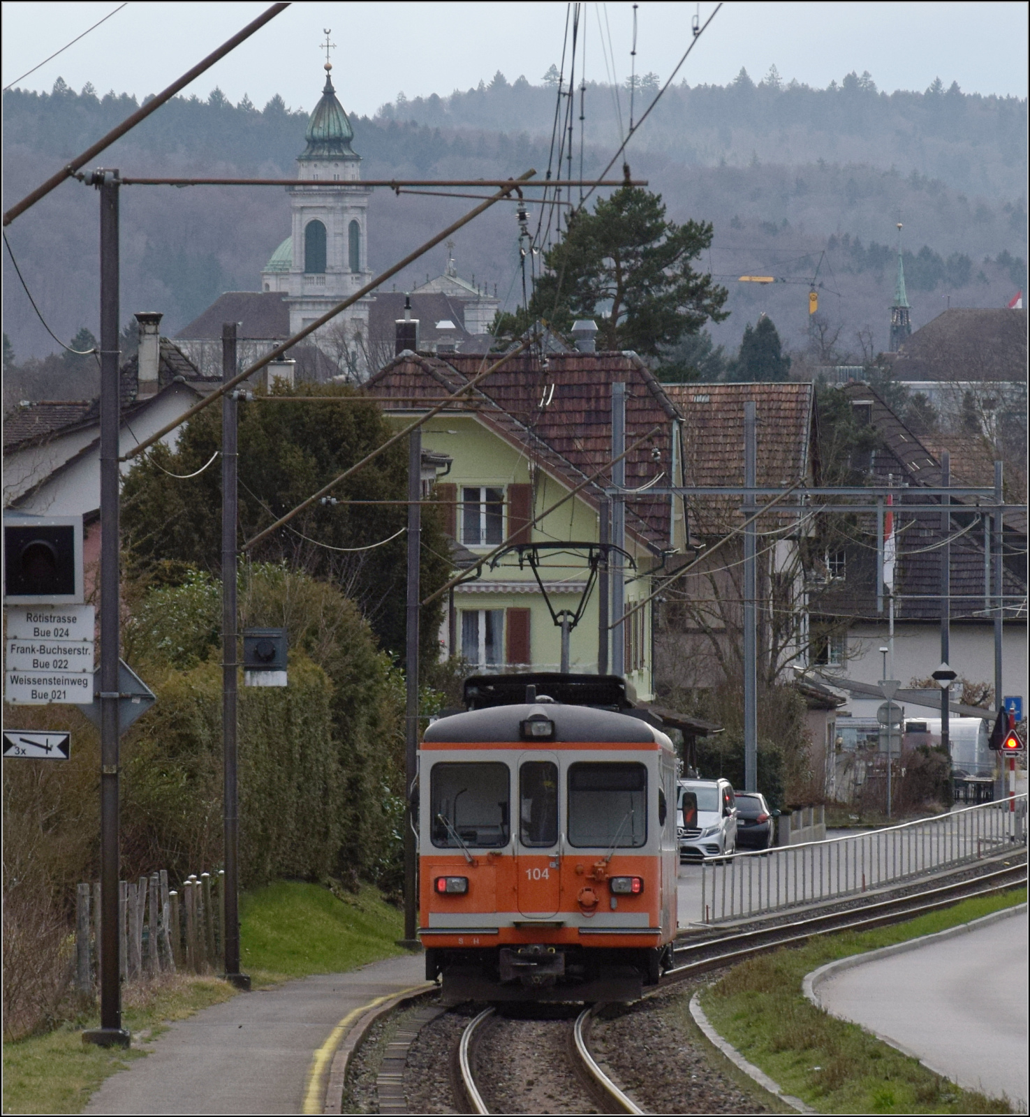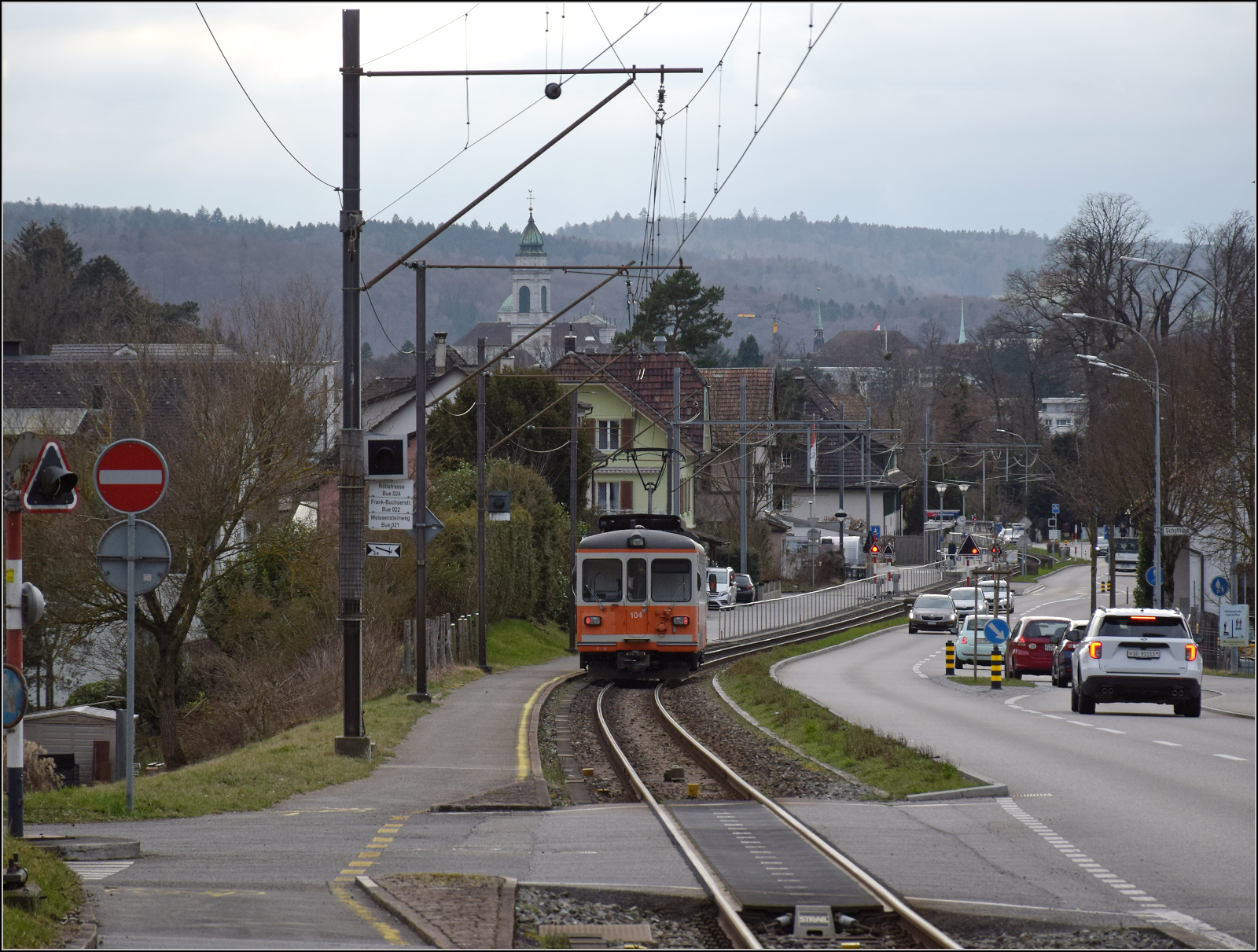 Be 4/4 104 an der Endhaltestelle in Solothurn. Februar 2026.