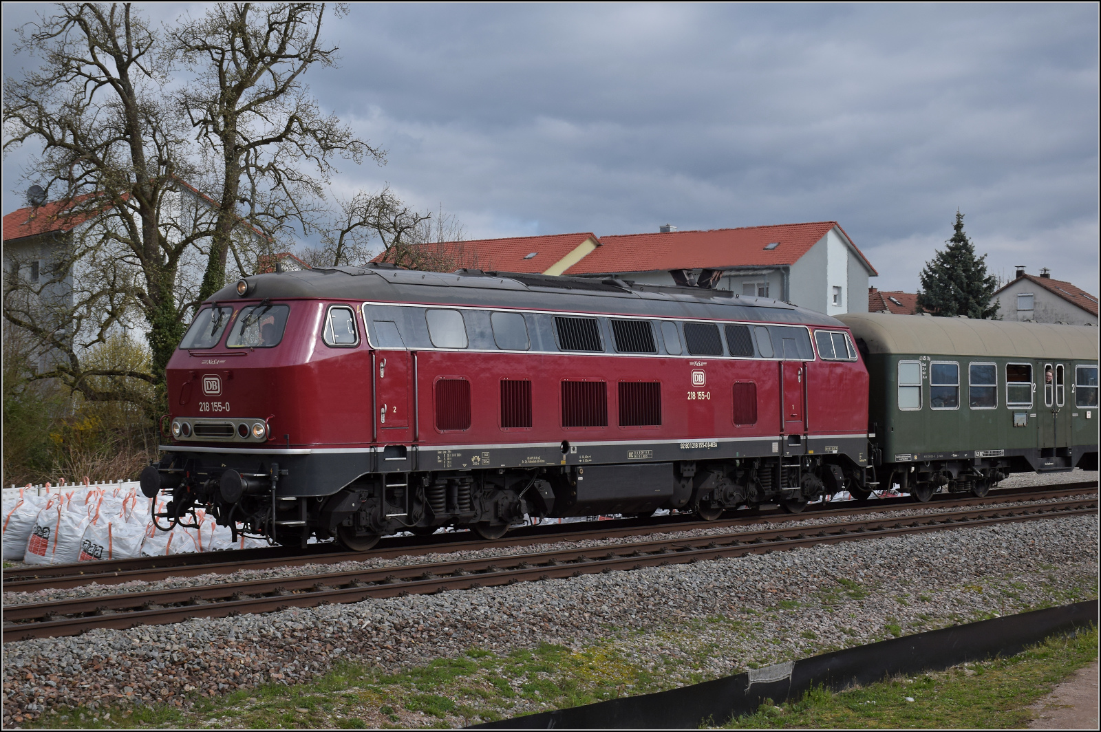 218 155 ist sicherlich eine angemessene Besetzung, sieht sie doch aus, als käme sie gerade aus der Märklinschachtel. Am künftigen Haltepunkt Warmbach, März 2026. km0