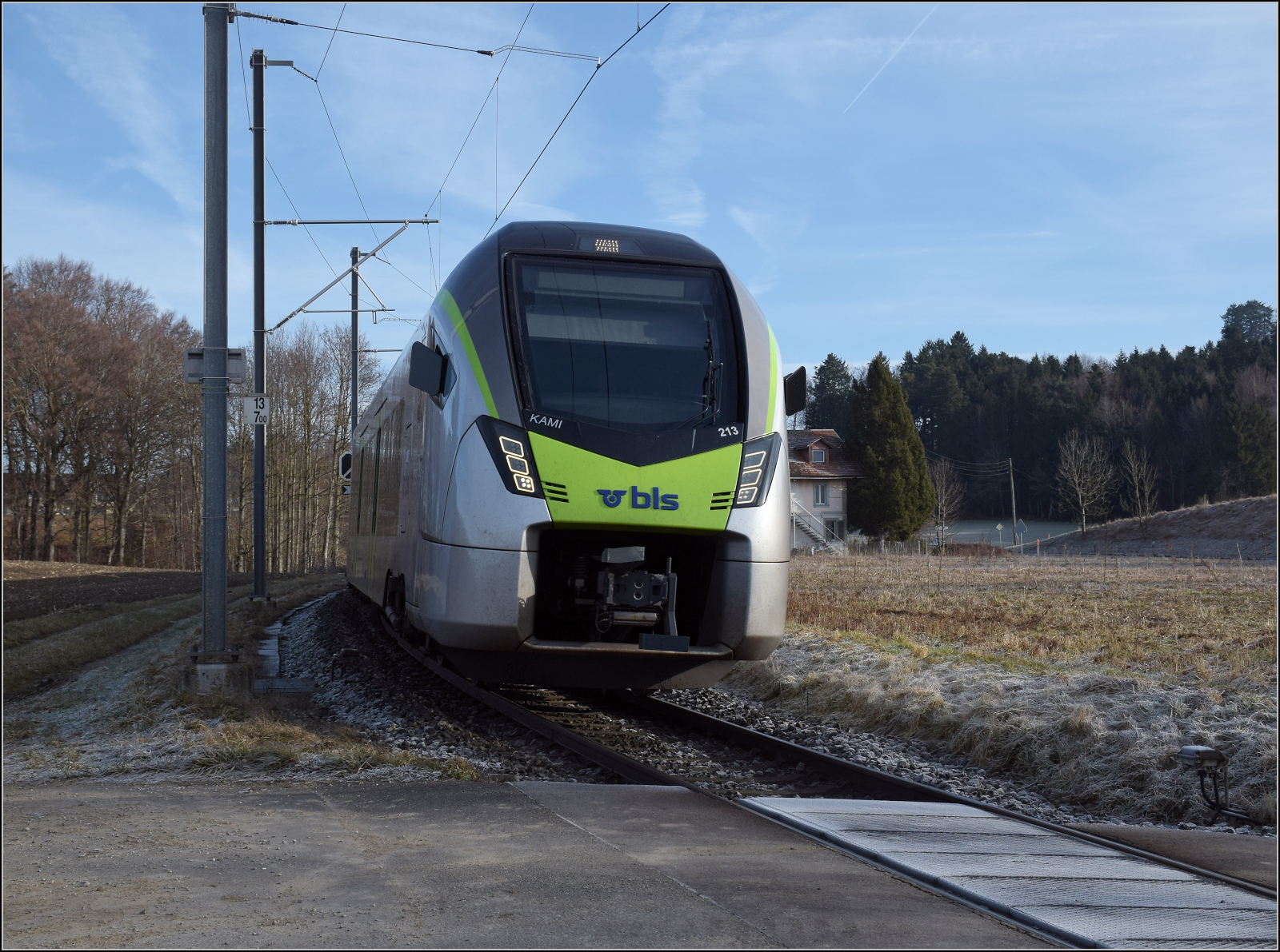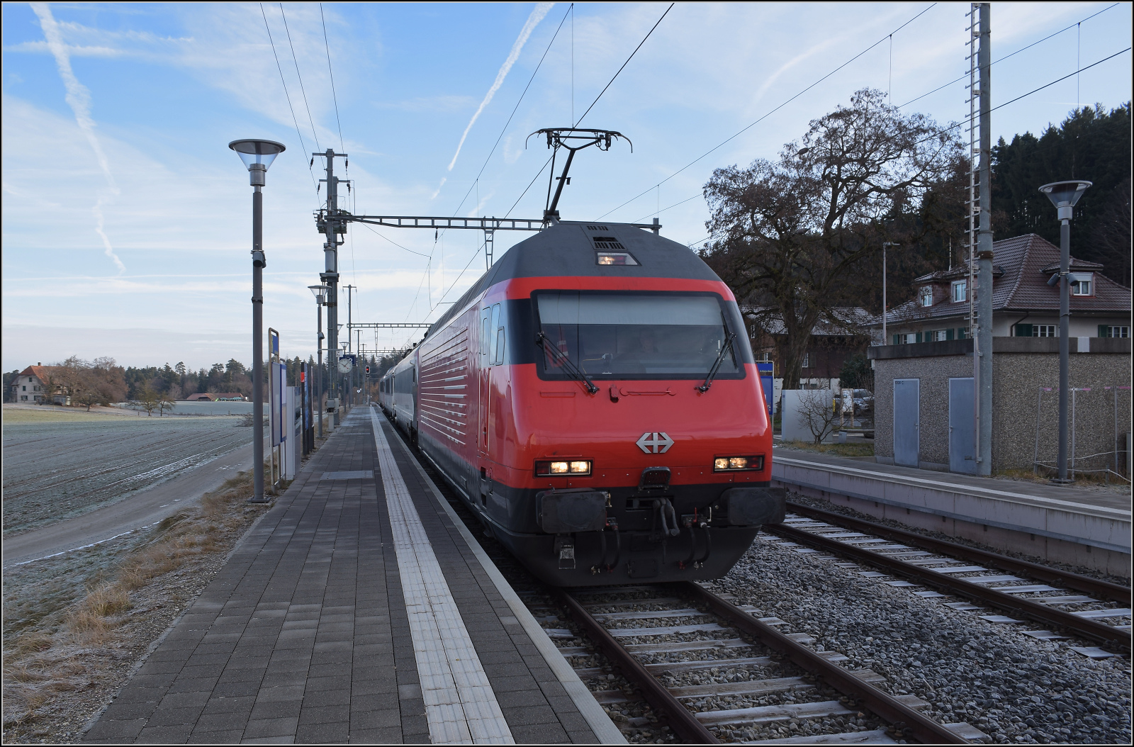 Zur Strafe für die Bemerkung langweilig schlich sich von hinten völlig unbemerkt direkt an uns diese Zugkomposition vorbei. Re 460 014 'Val de Trient', der Messtriebwagen XTmass 160 001, der Infrastrukturdiagnosewagen X 99 85 93-61 247-1 CH-SBBI und der IC-Steuerwagen Bt 50 85 28-94 918-5 CH-SBB. Diese Strafe ist wirklich annehmbar. Mittelhäusern, Januar 2026. km0